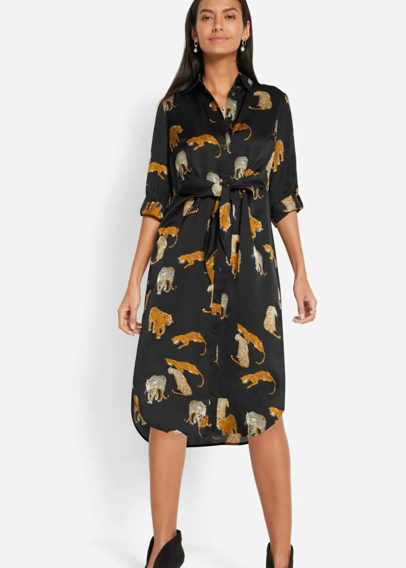 Bonito vestido camisero de satén con un moderno estampado de leopardo.