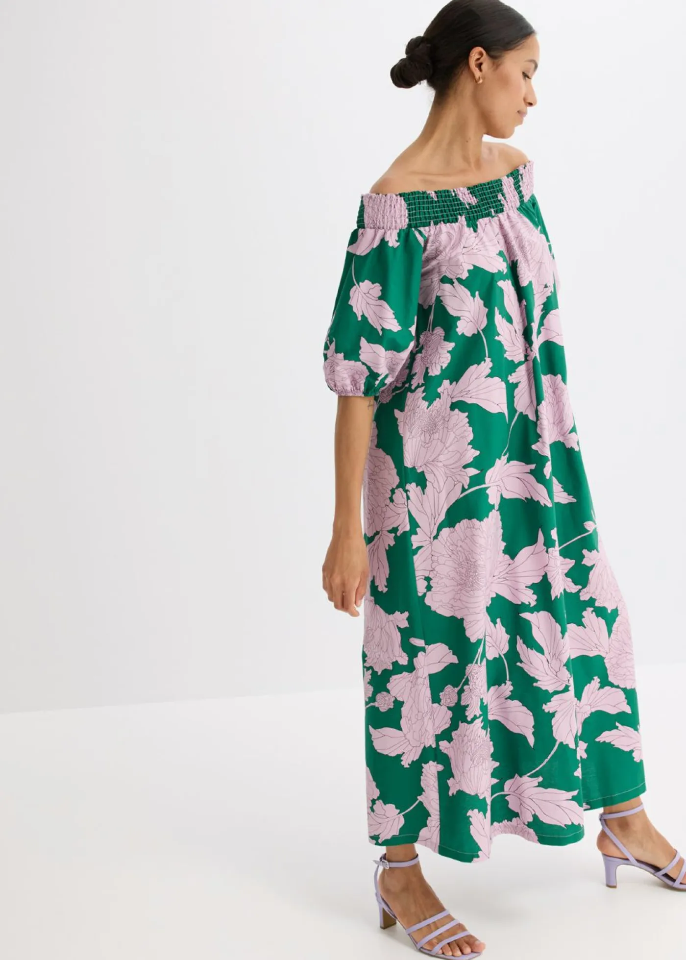 Vestido largo de popelín de algodón puro con estampado de flores y mangas abullonadas.
