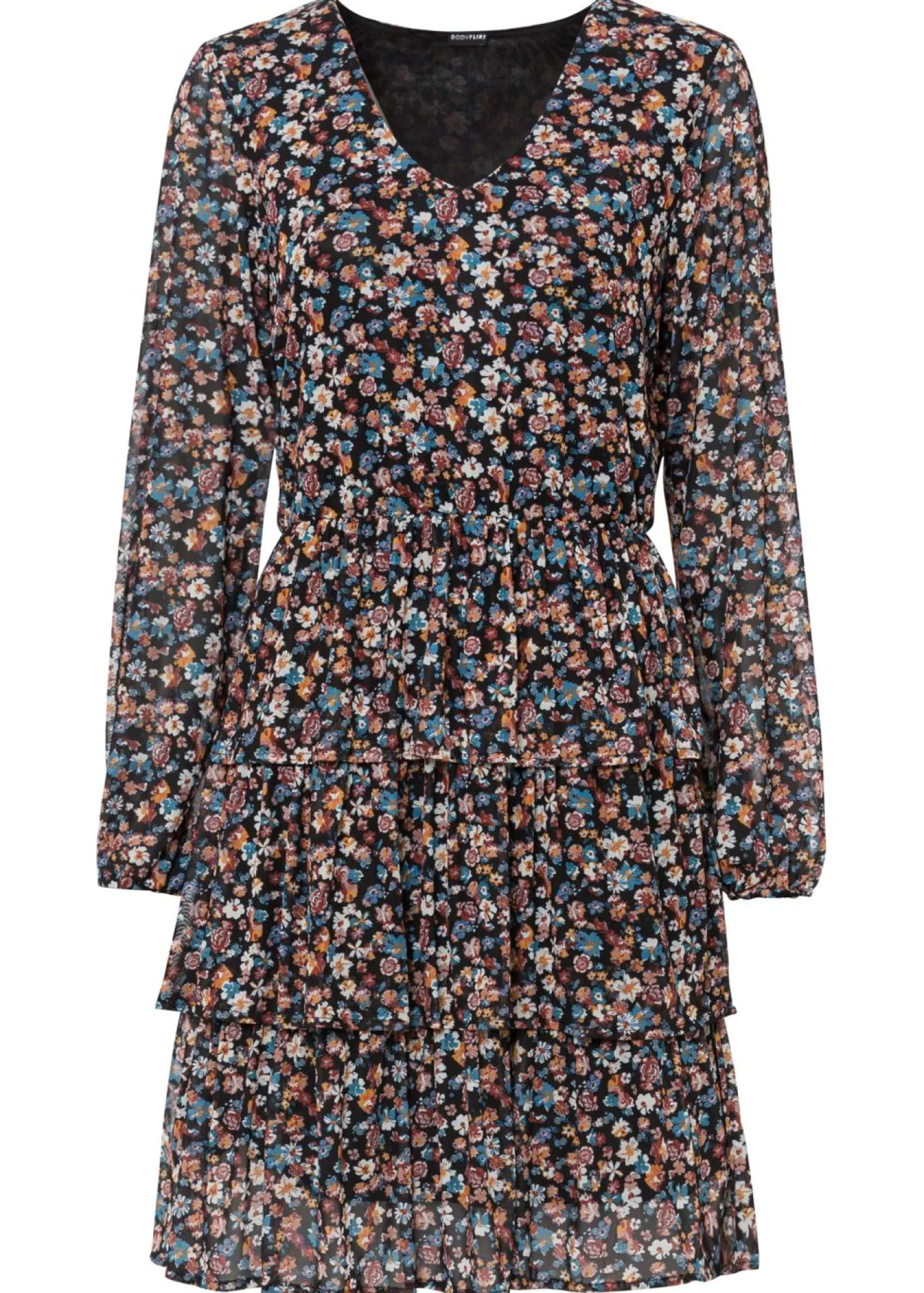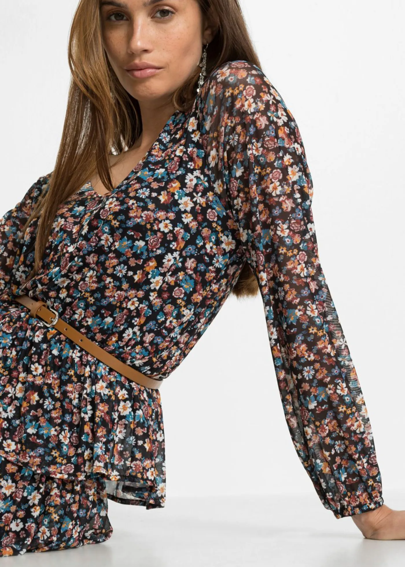 Precioso vestido de malla con mangas ligeramente transparentes y bonito estampado de flores.