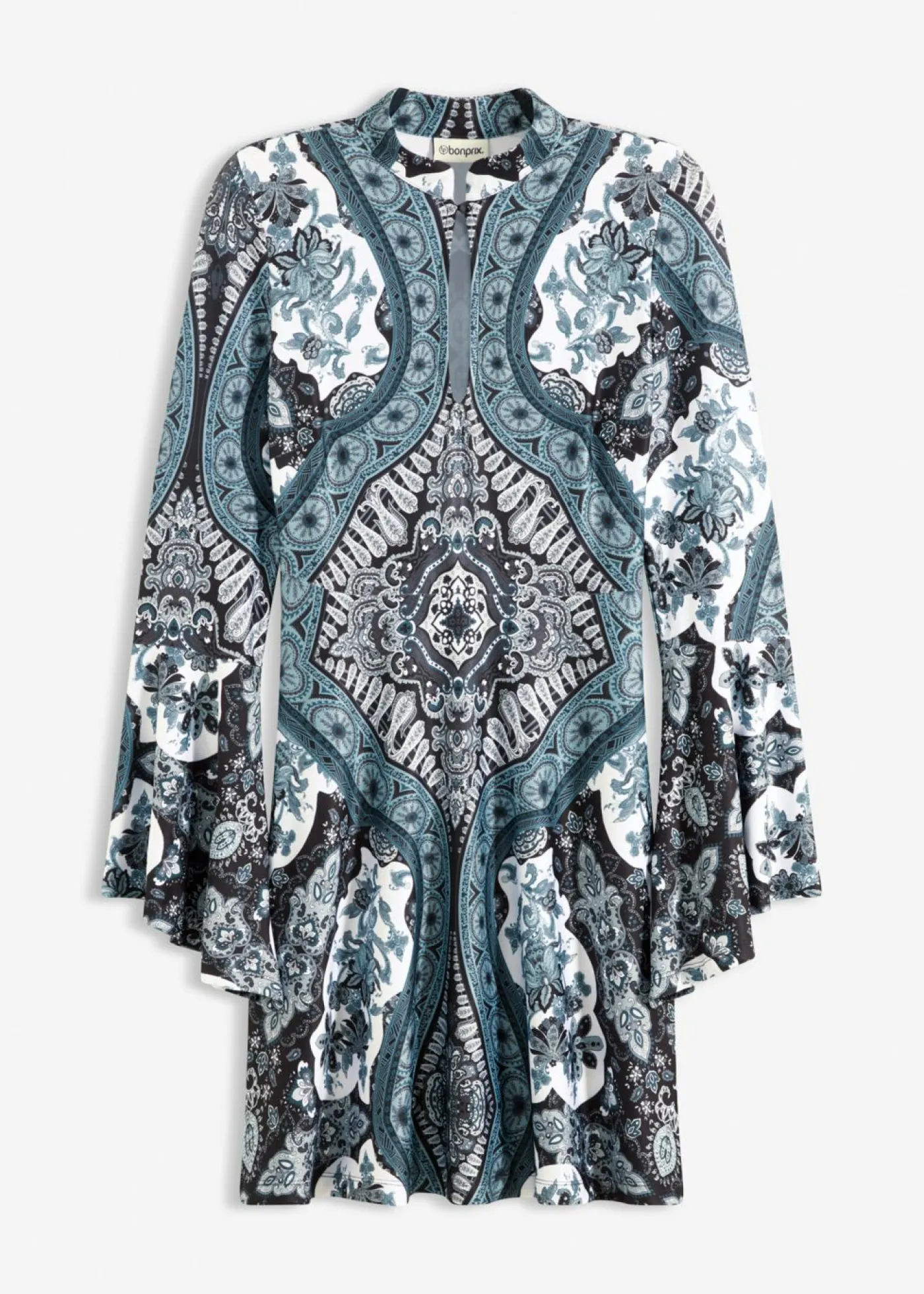 Moderno y femenino: Vestido de punto con aberturas en el escote y estampado.