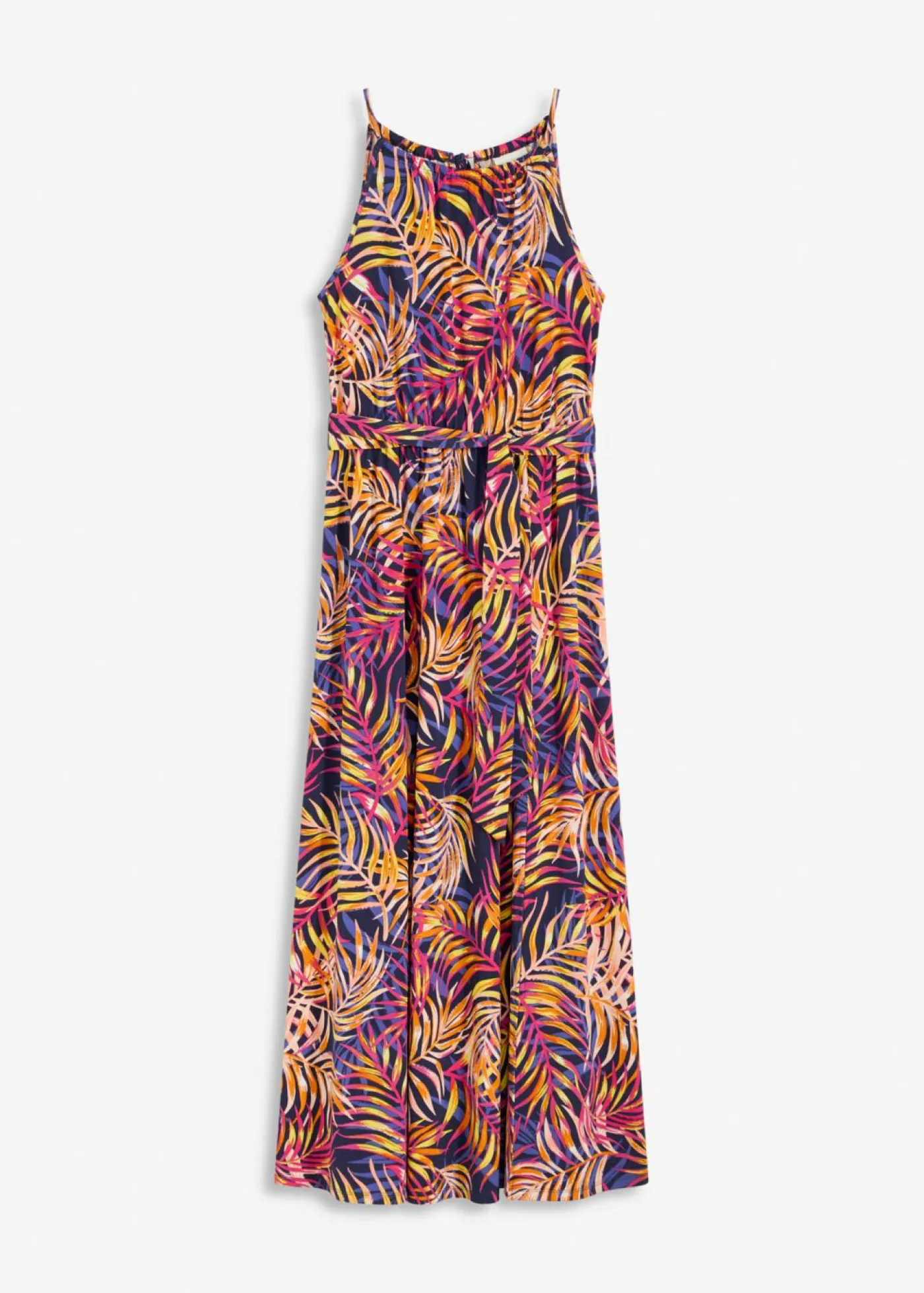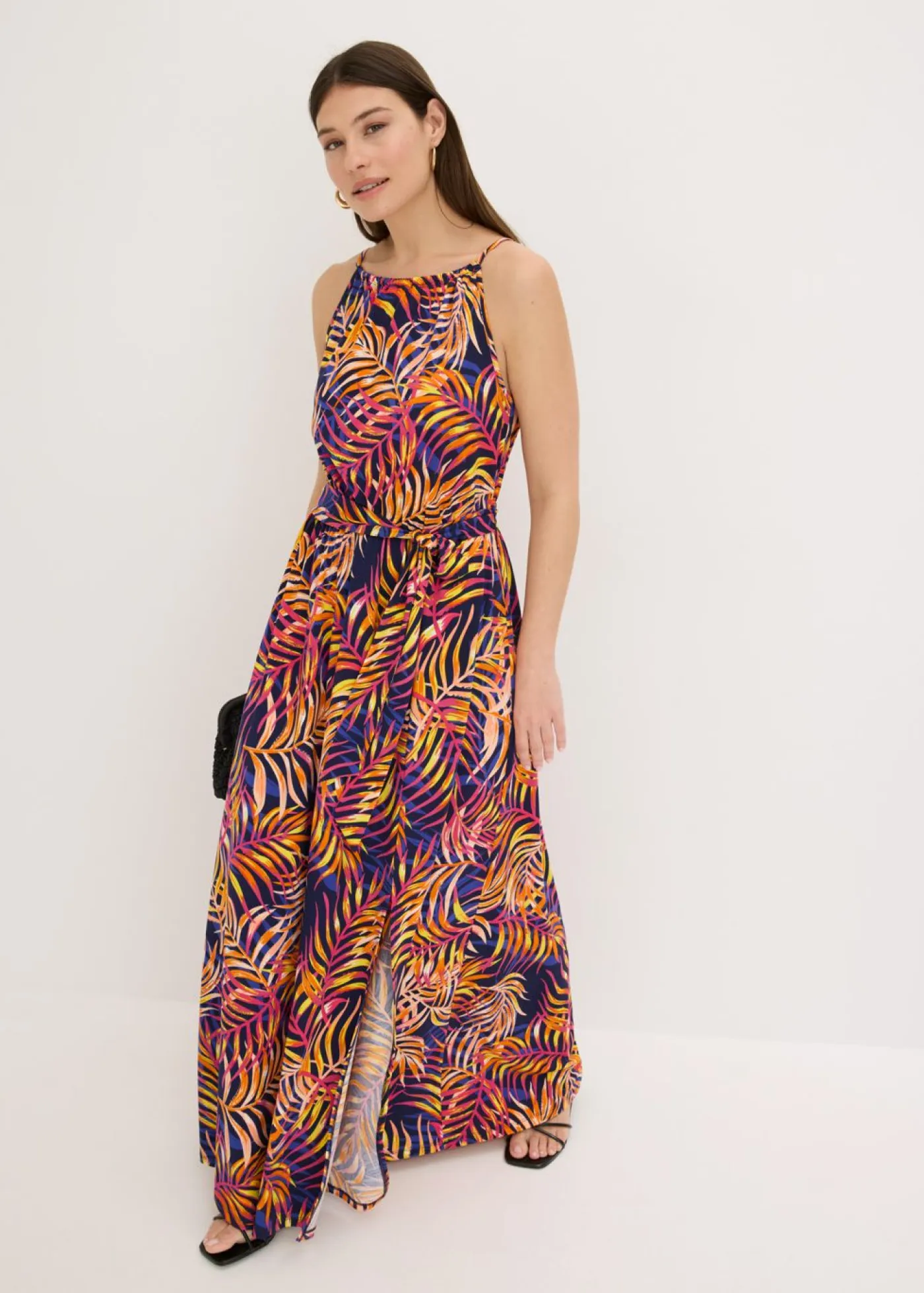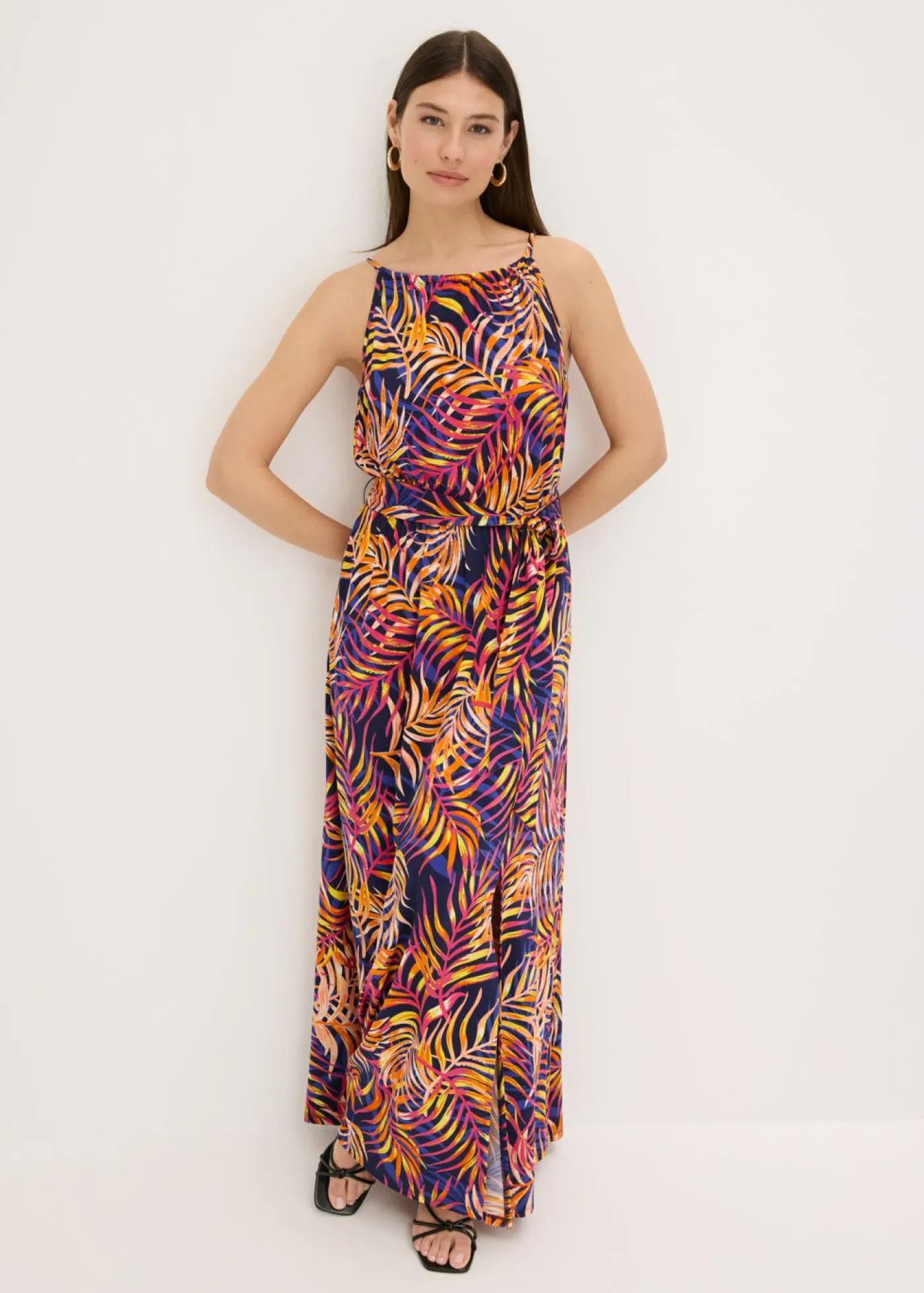 Vestido largo de punto con estampado de flores y cierre de lazo en la parte trasera en el escote.