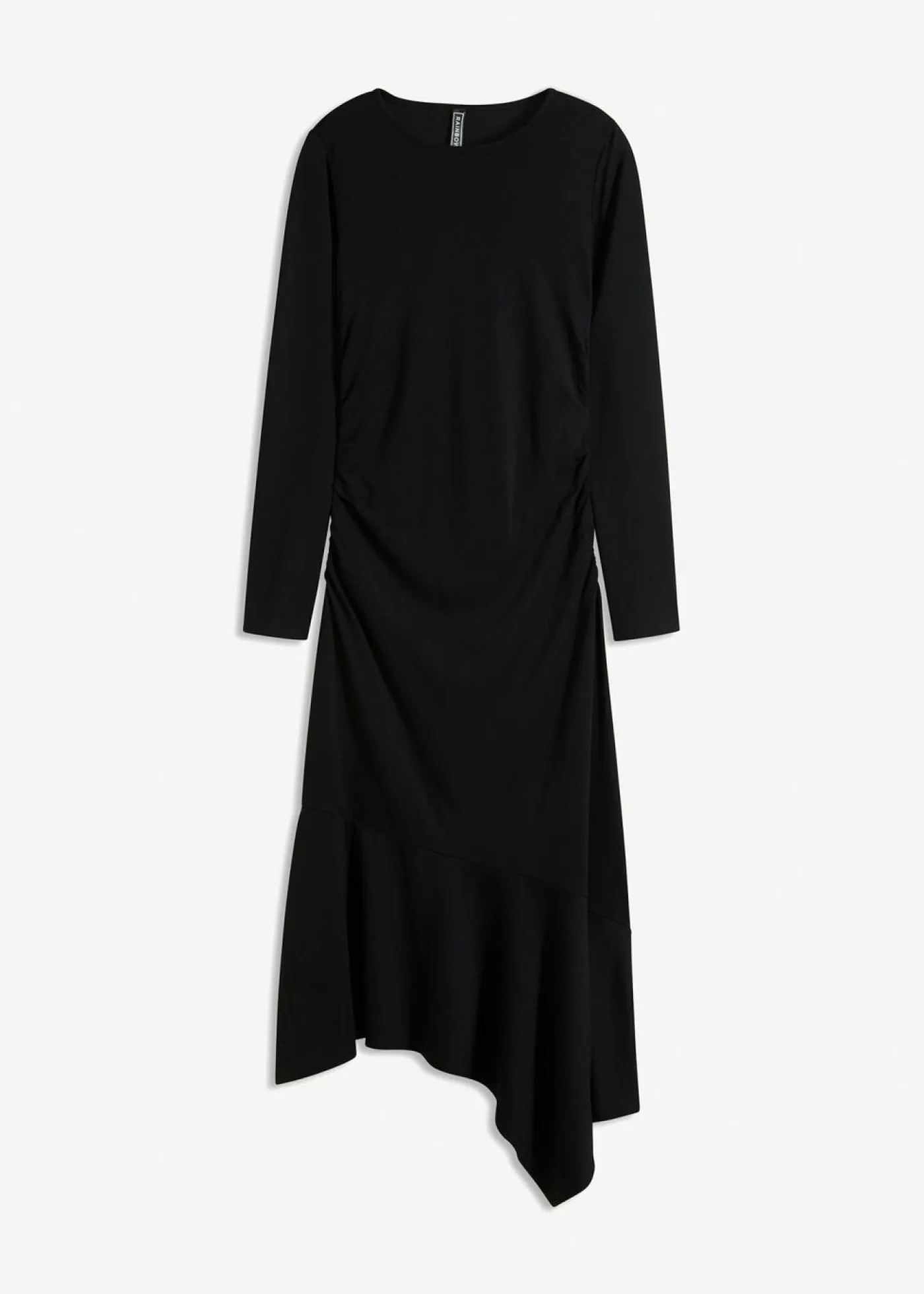 Vestido de punto con dobladillo asimétrico y mangas largas.