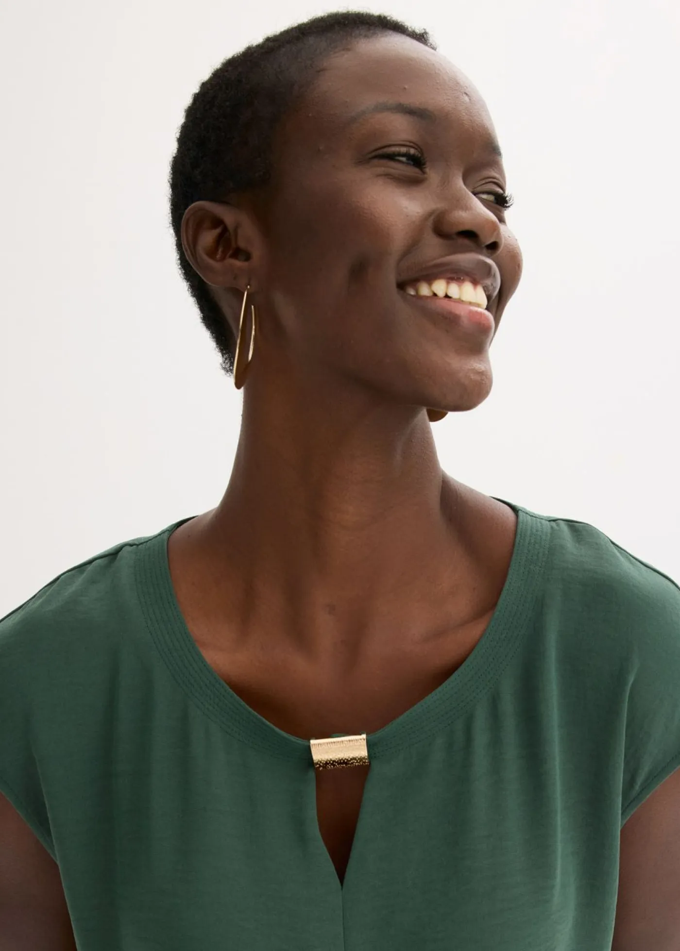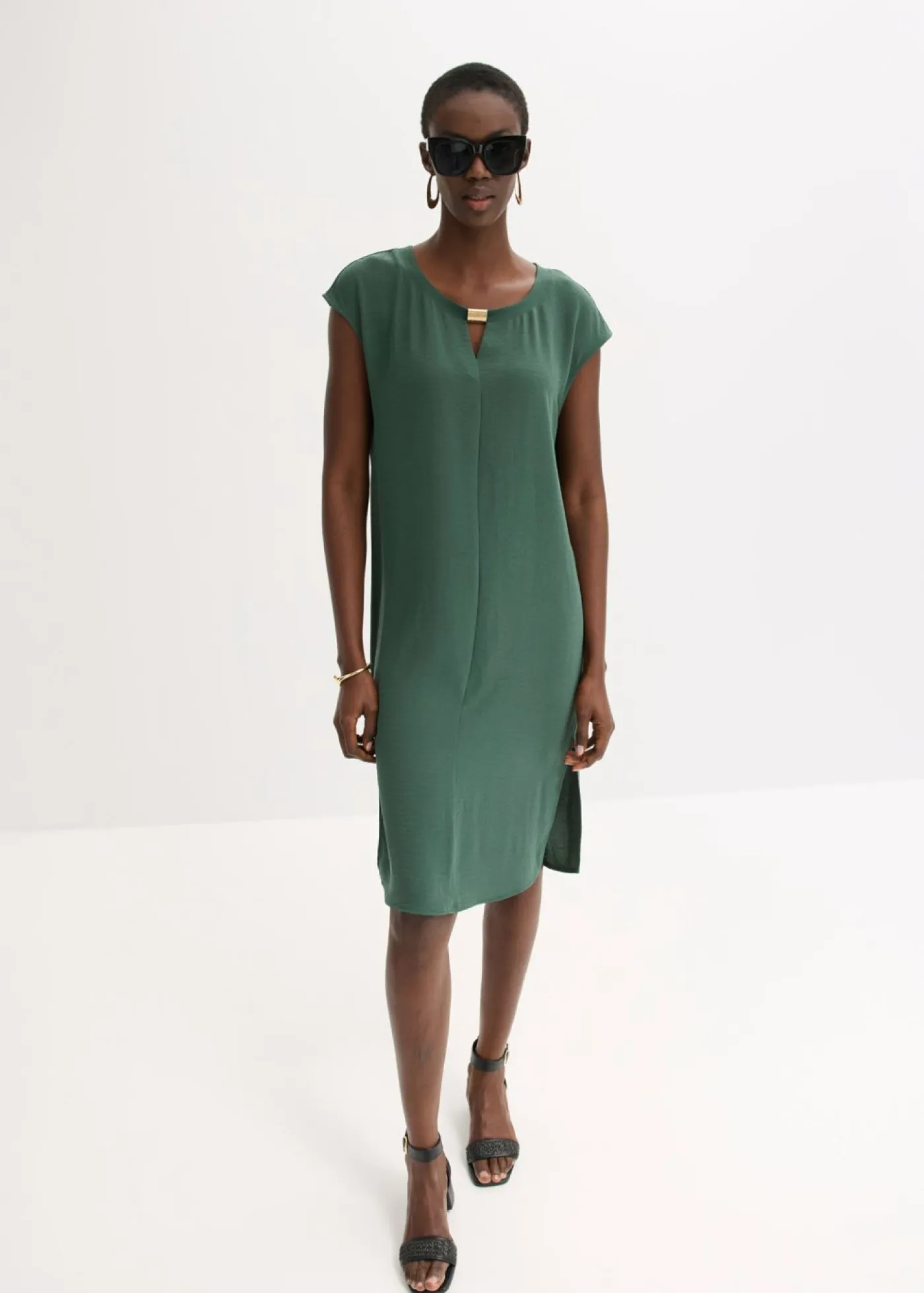Vestido elegante de tejido estructurado con anilla decorativa.