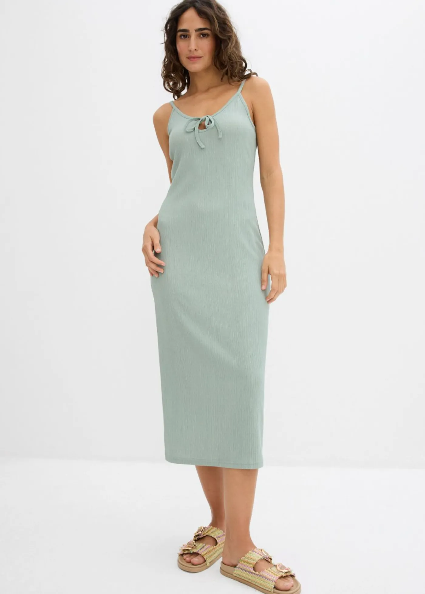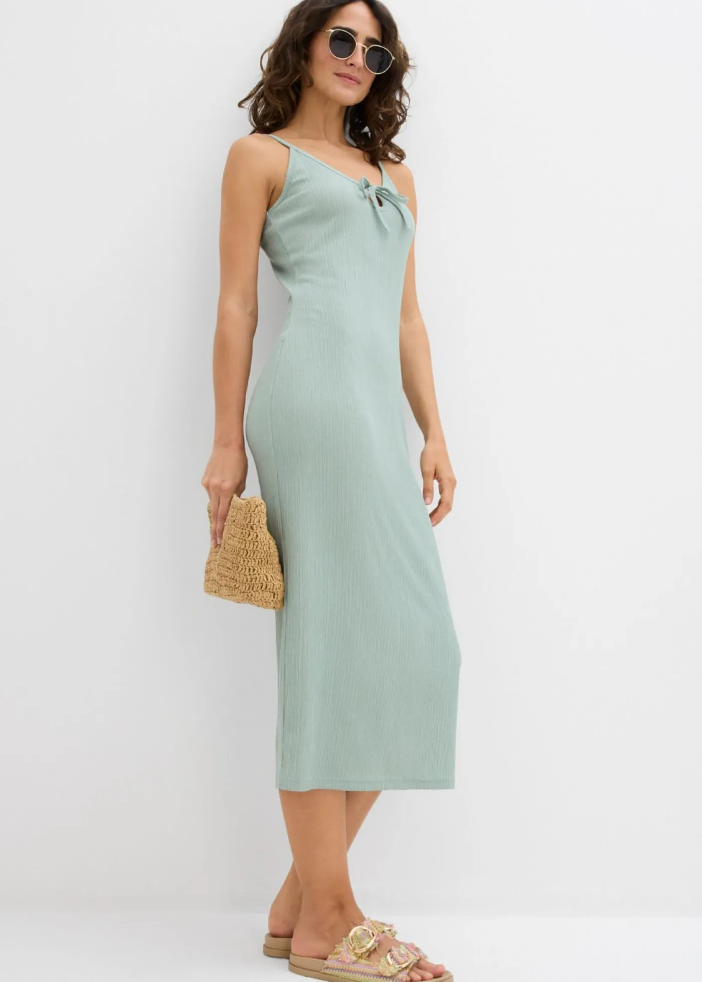 Moderno vestido midi de crepé ligero con detalle de lazo en el escote.
