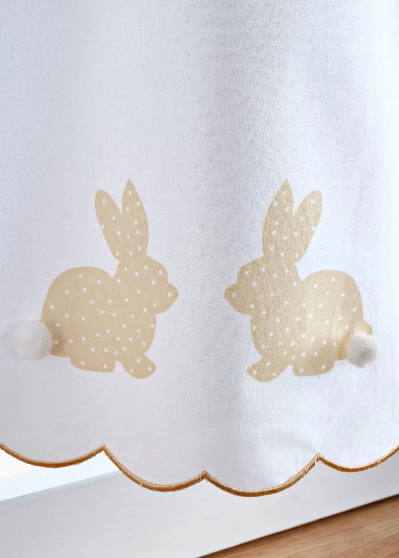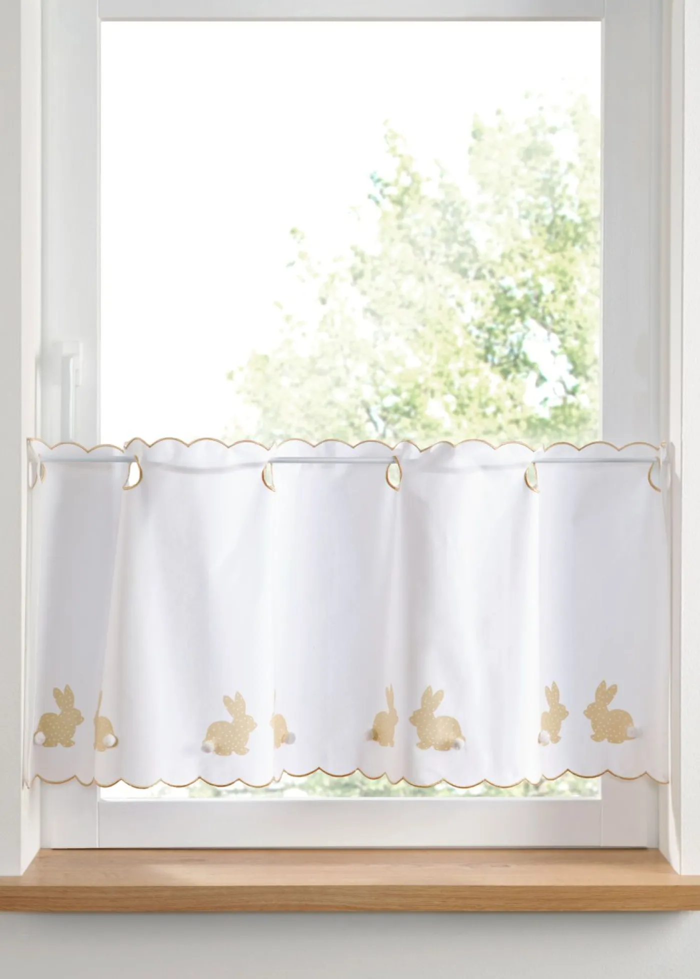 Cortina de cocina con motivo de conejitos para Pascua. Bonita cortina para ventana pequeña con simpáticos conejitos de Pascua estampados y un pompón adicional. ¡Una decoración de ventana discreto, pero inusual para Pascua!