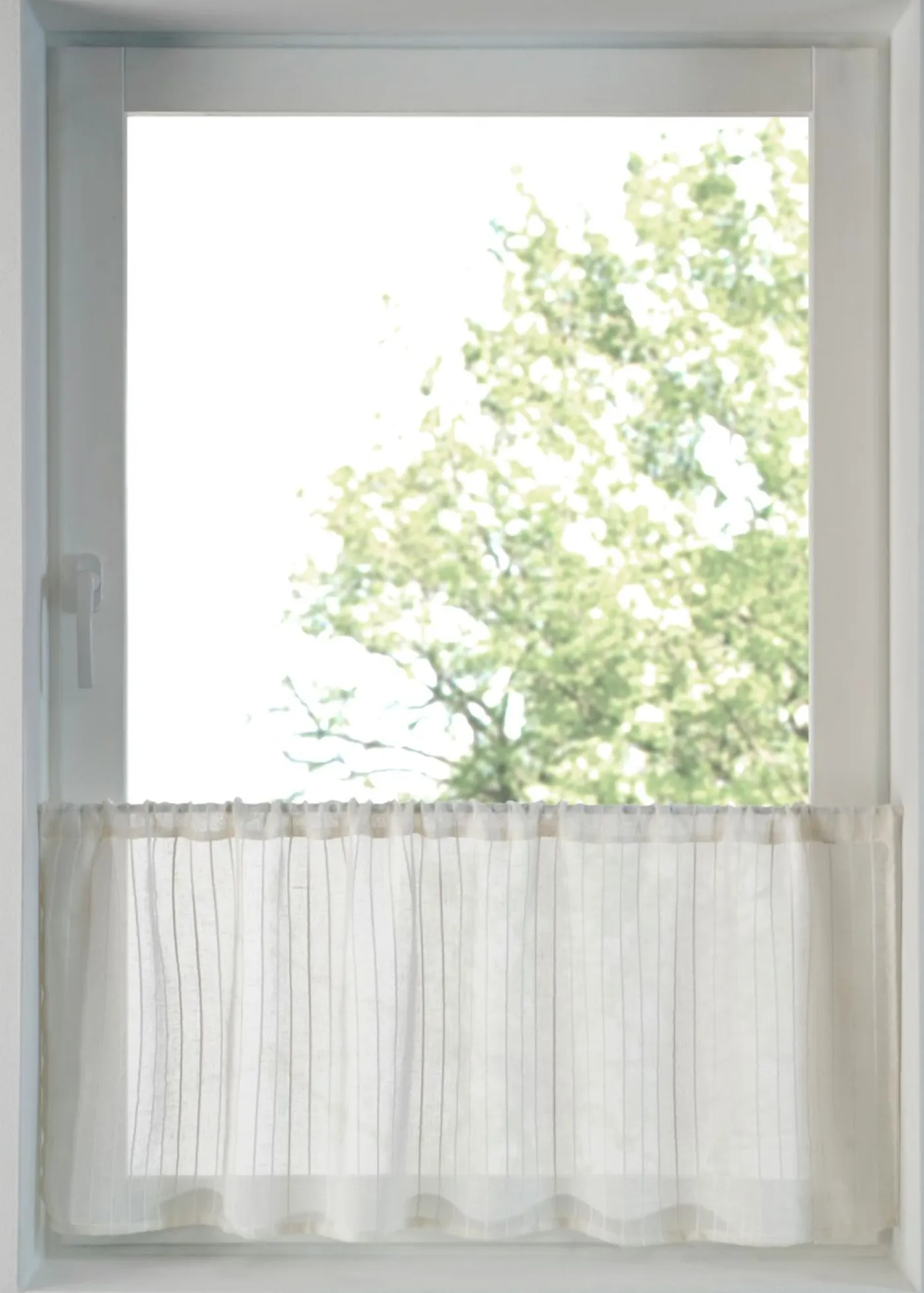 Cortina de cocina fina. La cortina de cocina tiene rayas sutiles y es de color blanco, para que adorne discretamente su ventana.