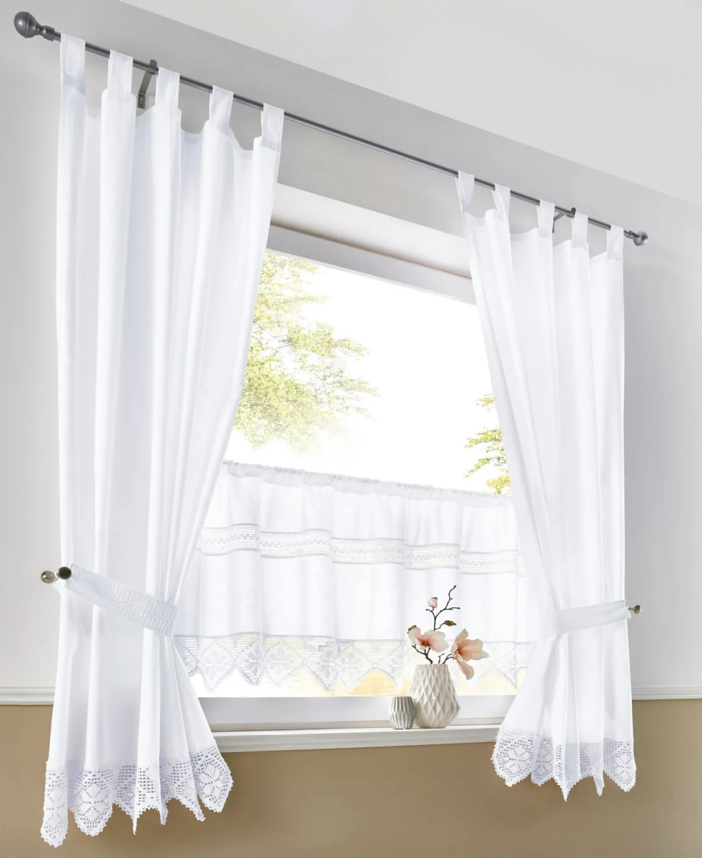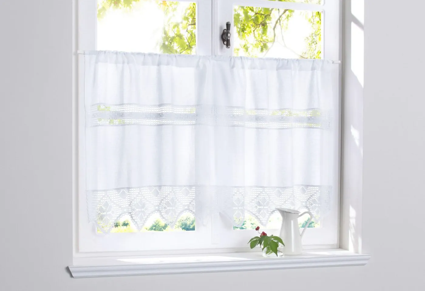 Cortinilla en tejido opaco con una ancha tira de encaje de ganchillo acabada en picos en la parte inferior que le da un aire muy refinado a la ventana. La medida corresponde a la tela.
