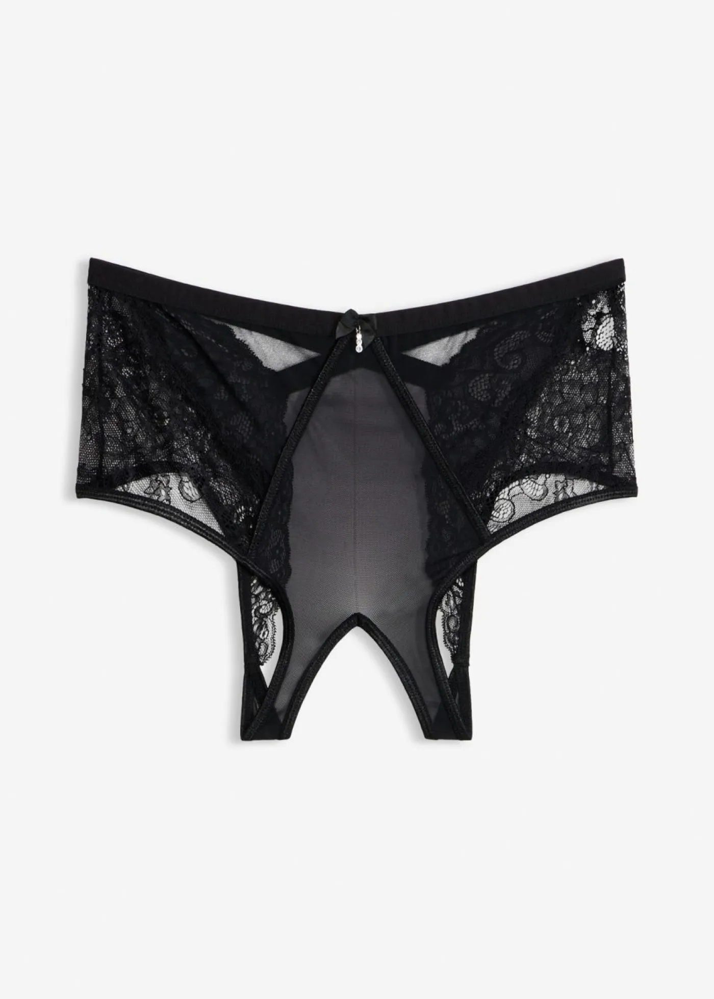 Sugerente braguita con abertura. Seduce a tu pareja con esta bonita braga de talle alto con abertura. Esta braga hasta la cintura viene decorada con un ligero encaje en los laterales y te hará sentir como si no llevaras nada. Destaca por su abertura trasera y el brillante accesorio en la cintura. La braga también está disponible en talla grande.
