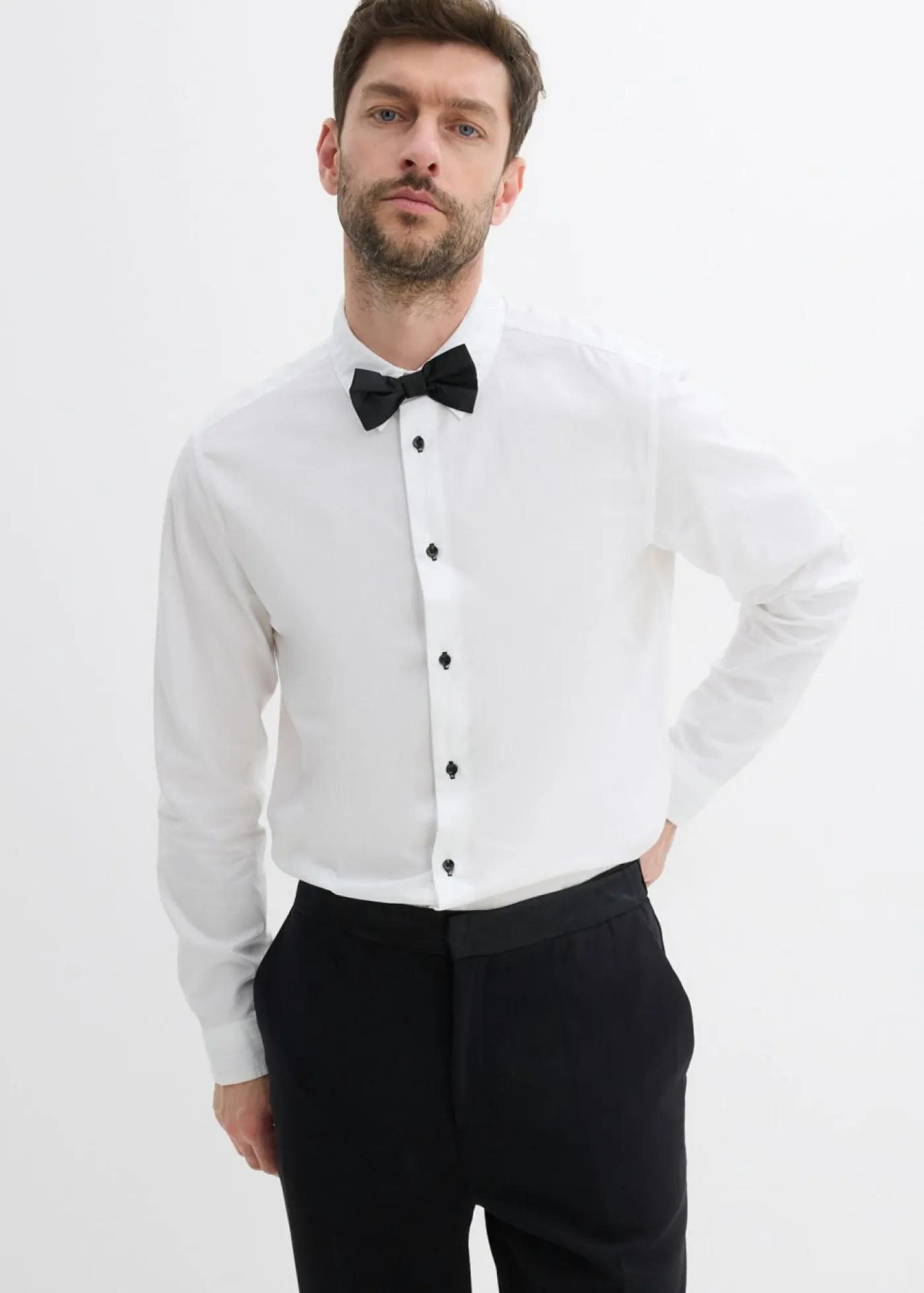 Elegante camisa con pinzas/camisa clásica de corte regular con botones negros y pajarita de satén a juego.