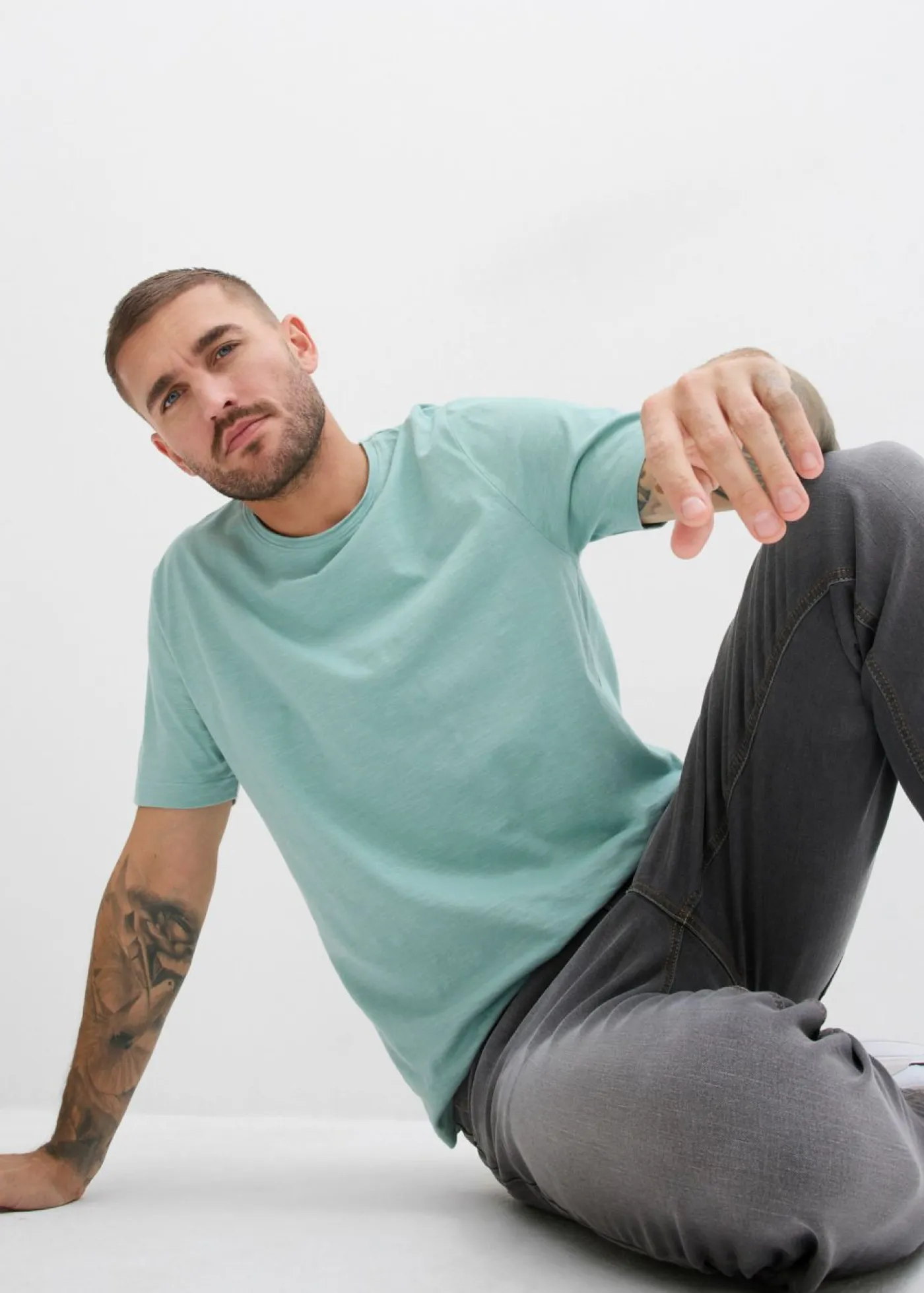 Moderna camiseta con bordes abiertos en el escote y una pequeña etiqueta metálica en la costura lateral.