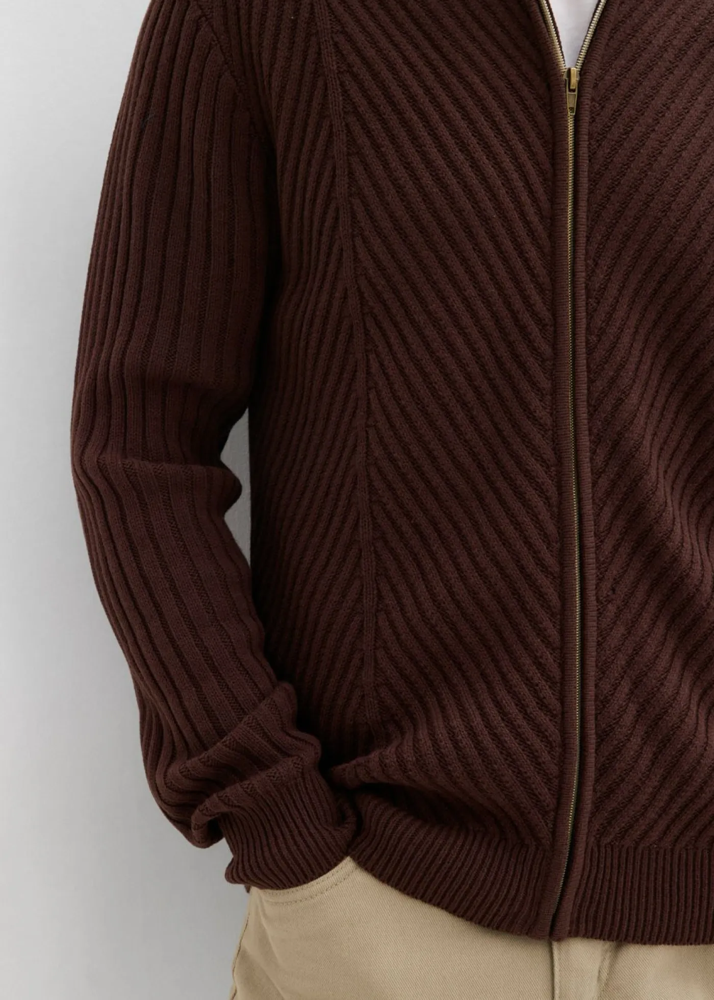 Chaqueta moderna de punto con corte regular, cuello alto y una llamativa cremallera metálica.