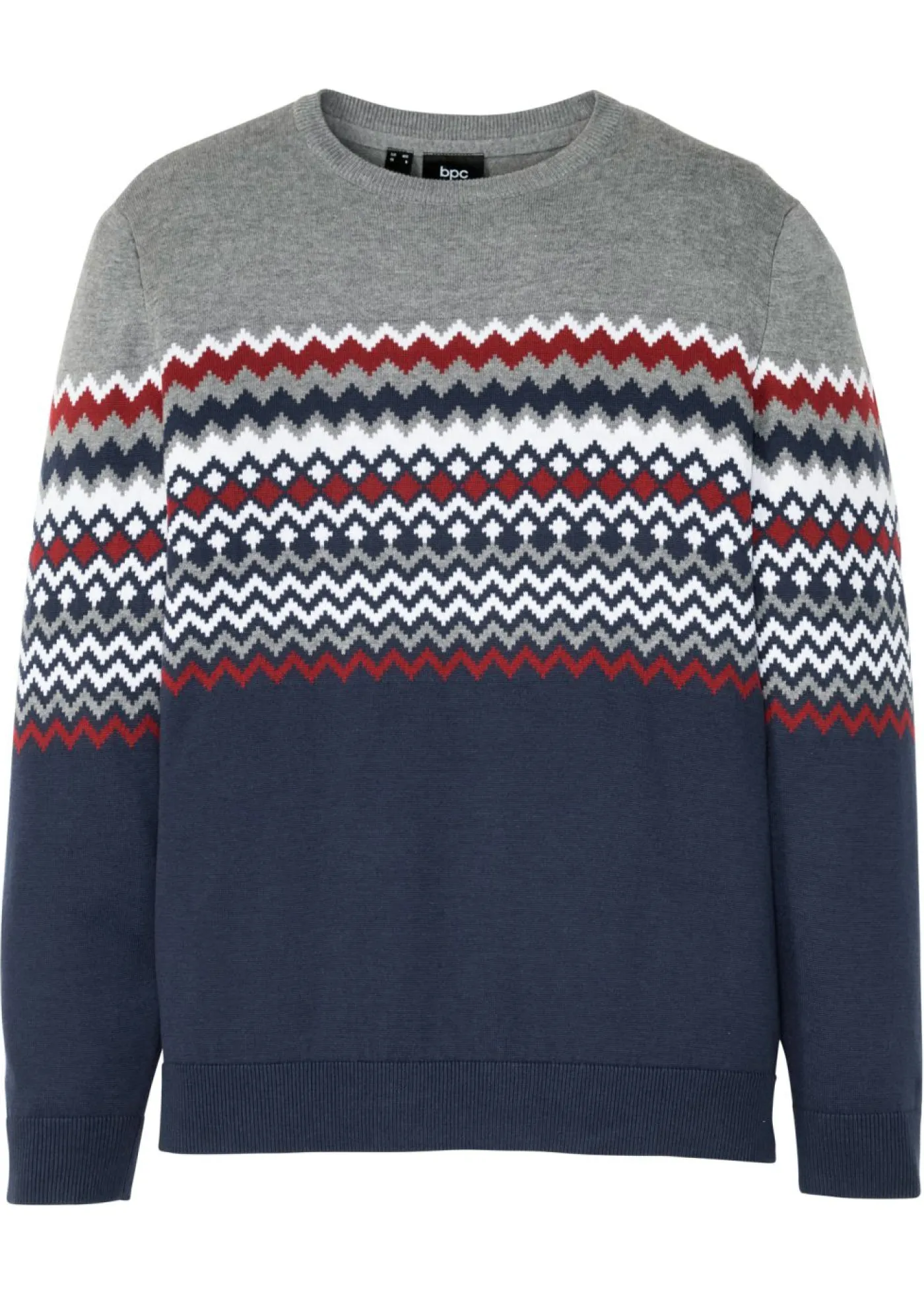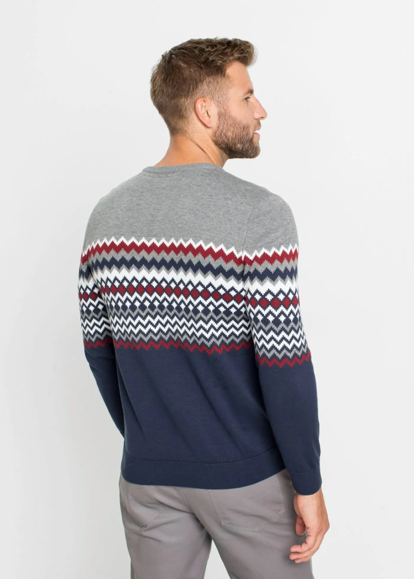 Jersey con patrón nórdico con puños en las mangas y el dobladillo. De cuello redondo. Se puede lavar a máquina.