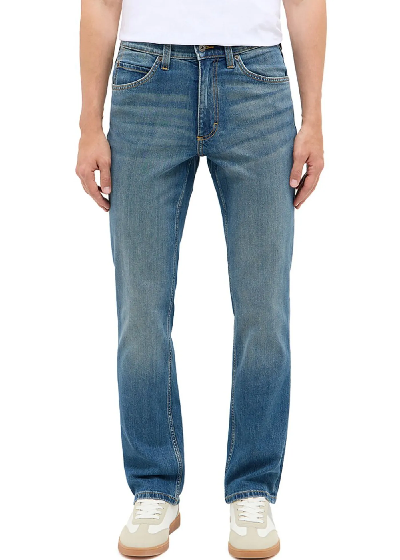 Vaqueros Mustang modernos con efecto lavado desgastado y pernera recta.