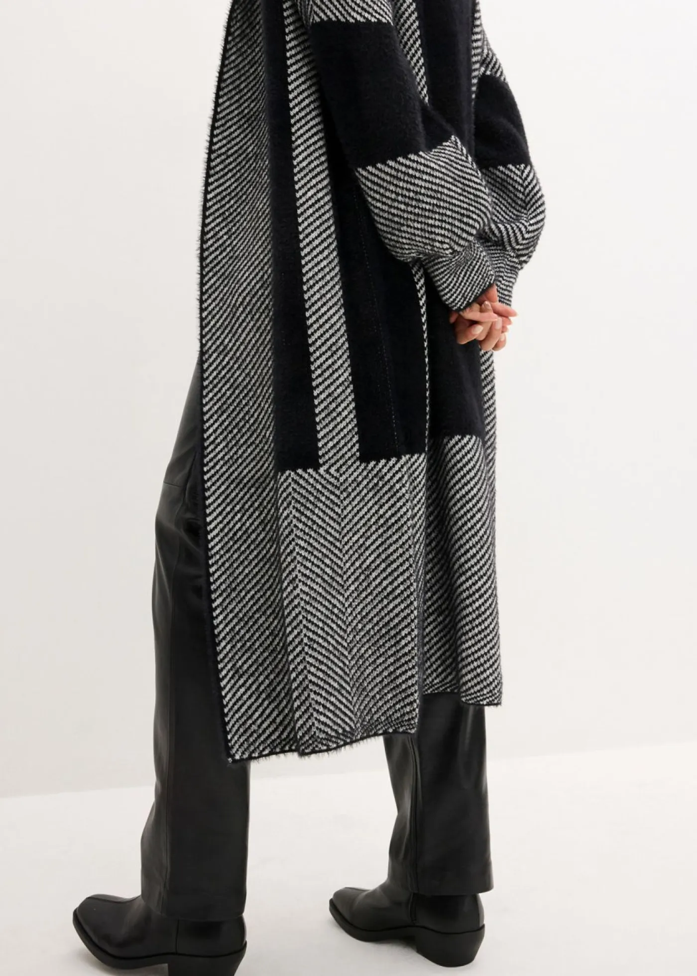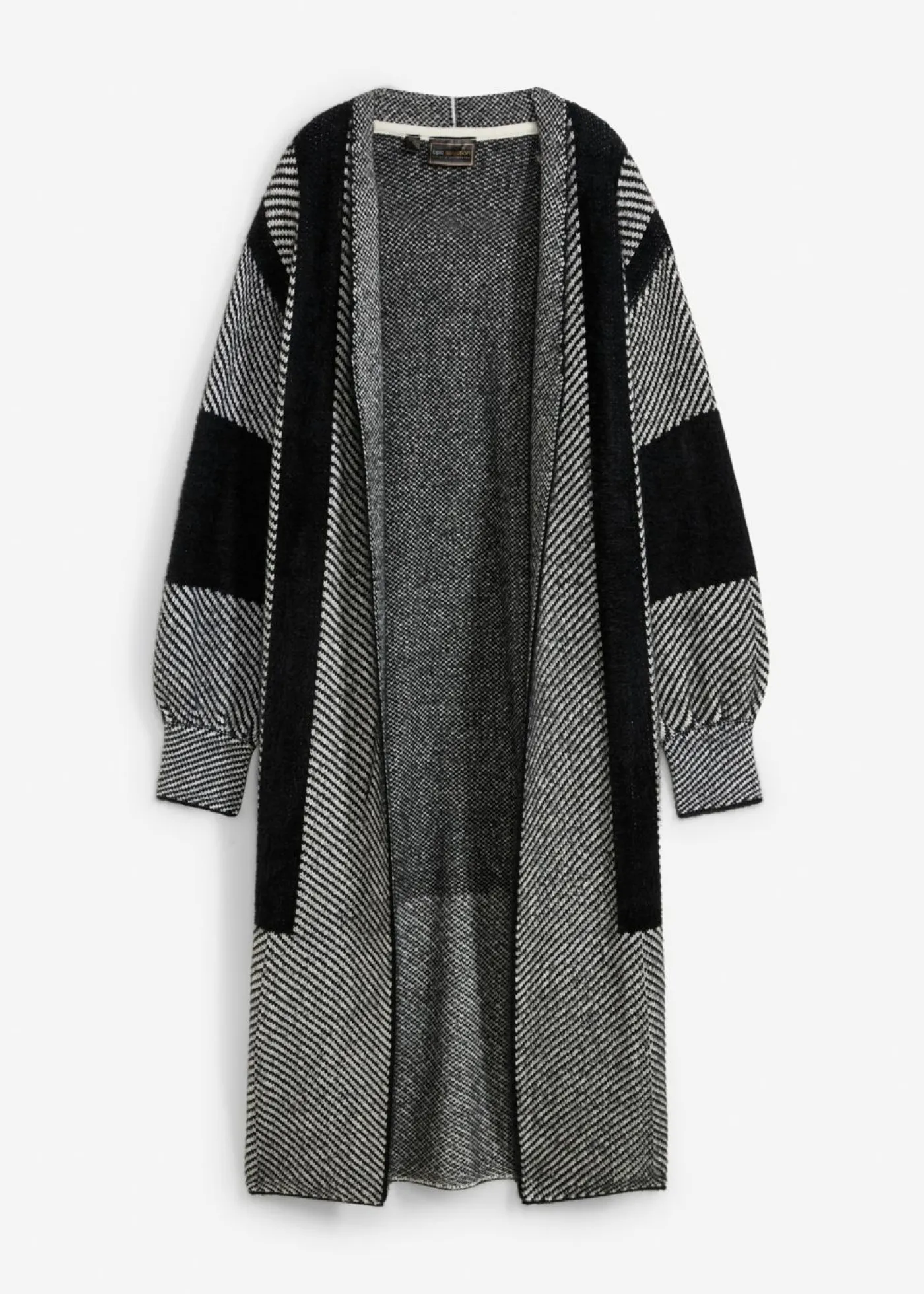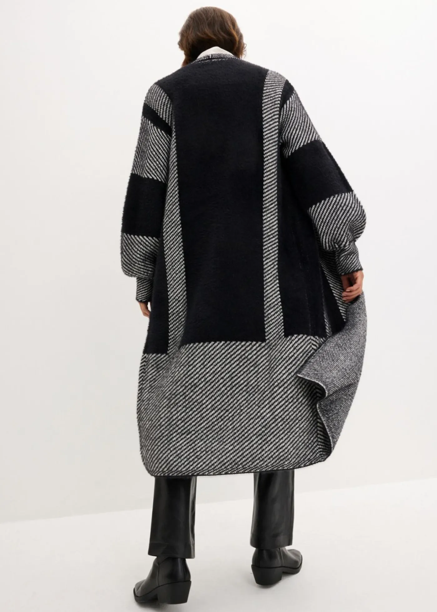 Abrigo femenino de punto con diseño gráfico.