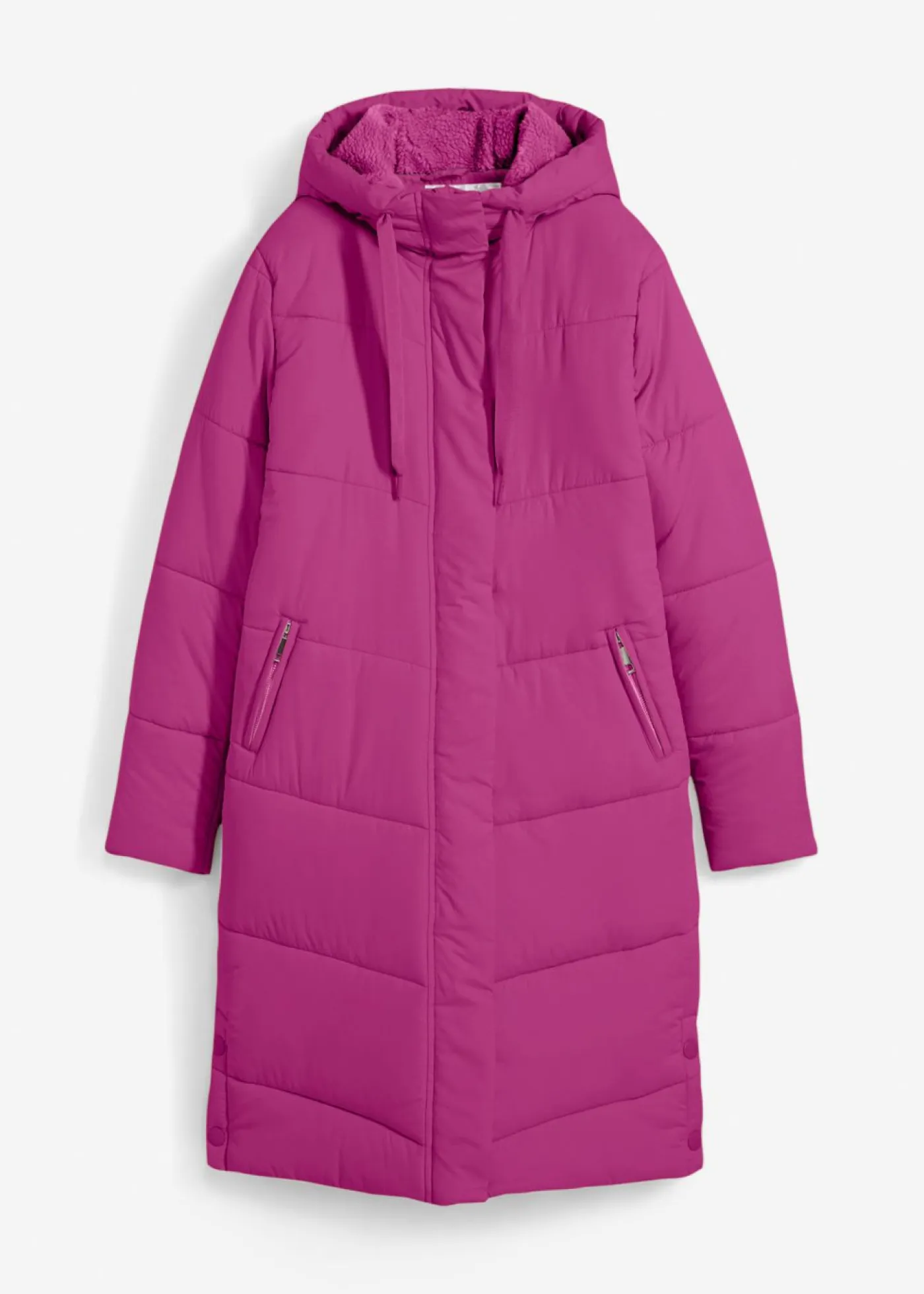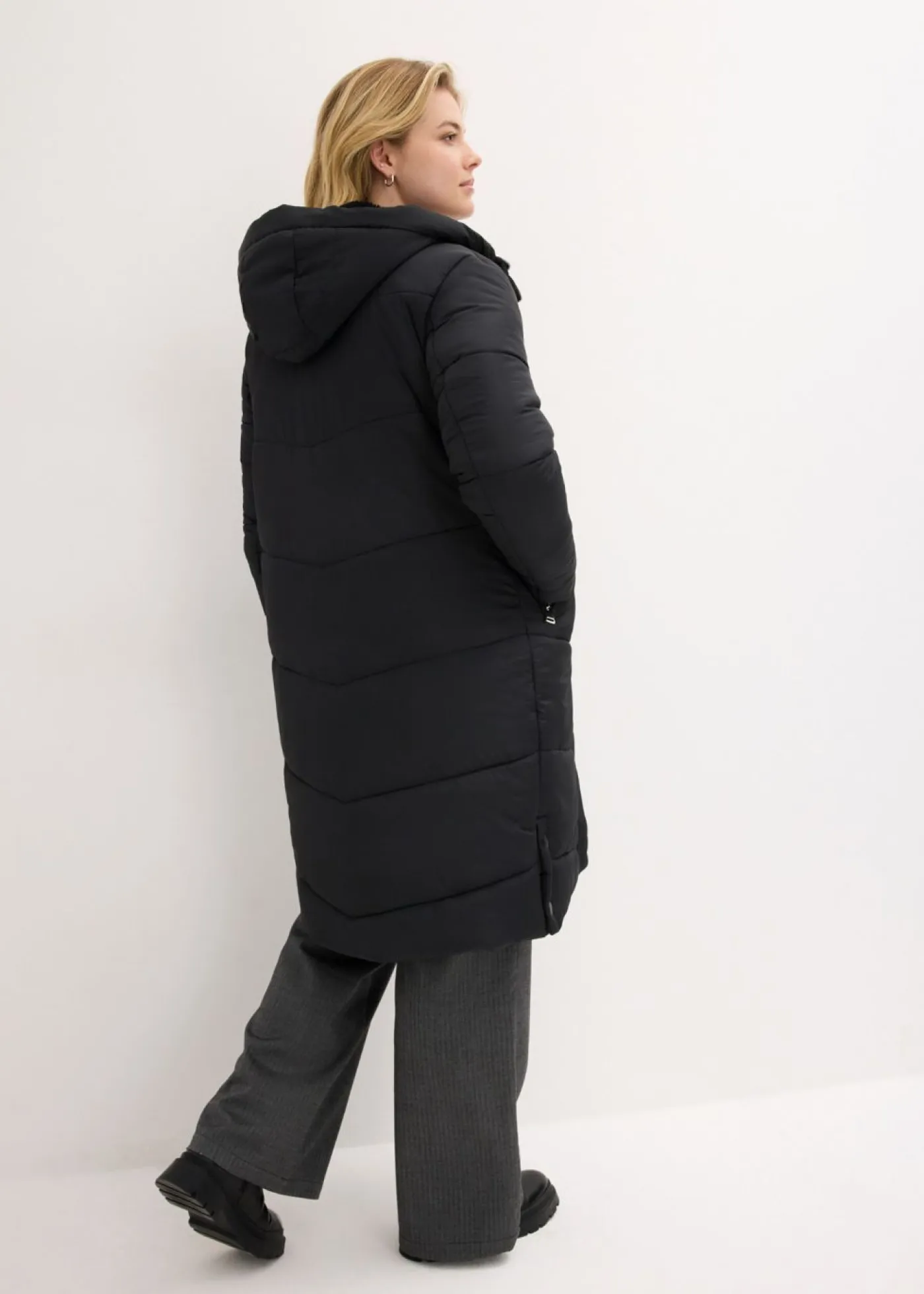 Moderno abrigo acolchado con capucha y forro polar.