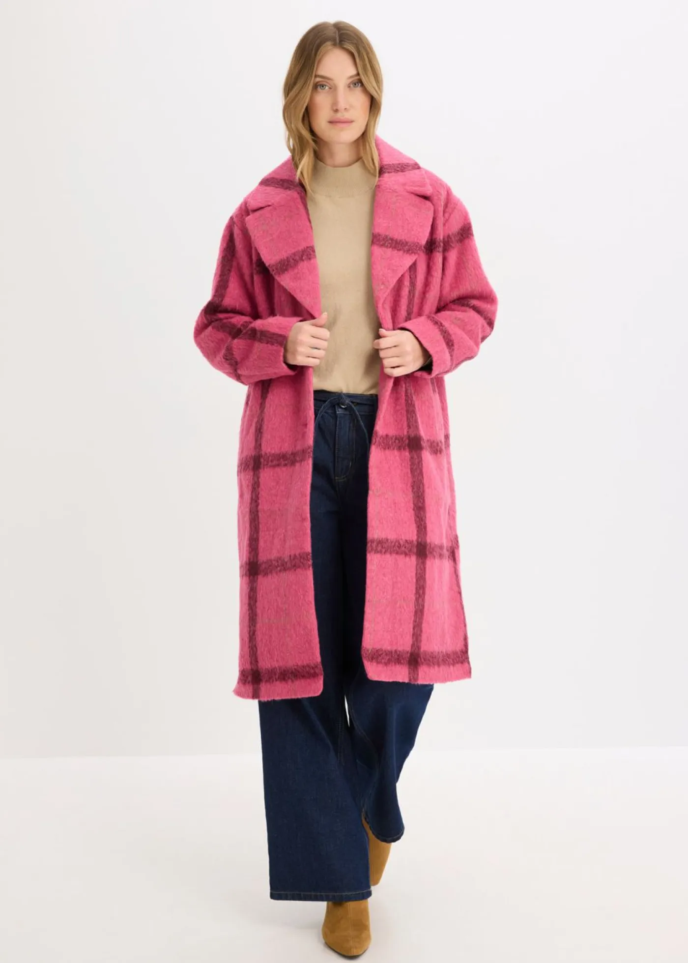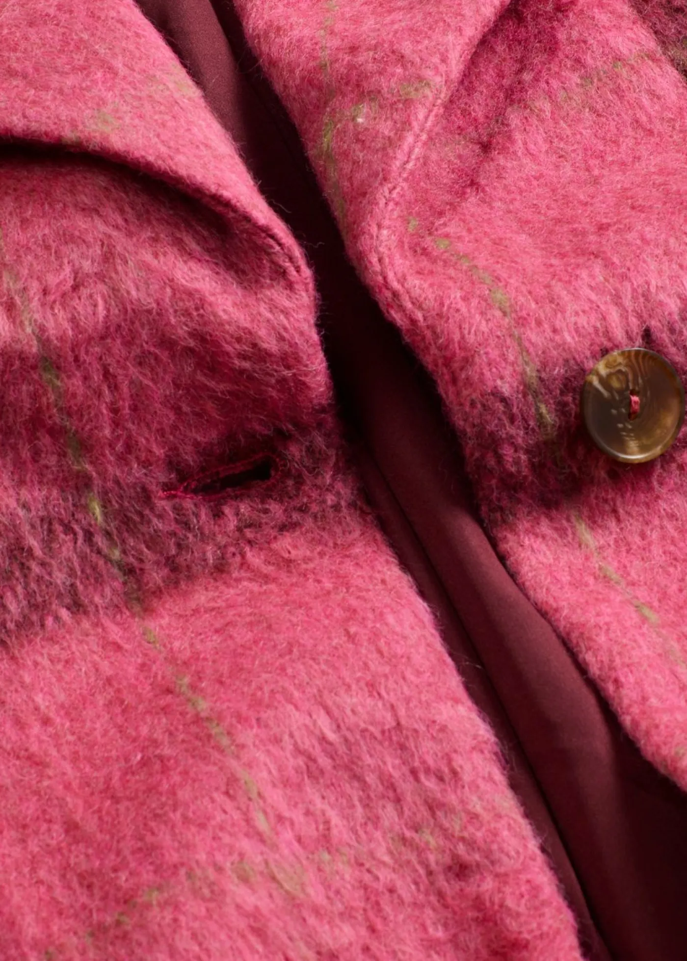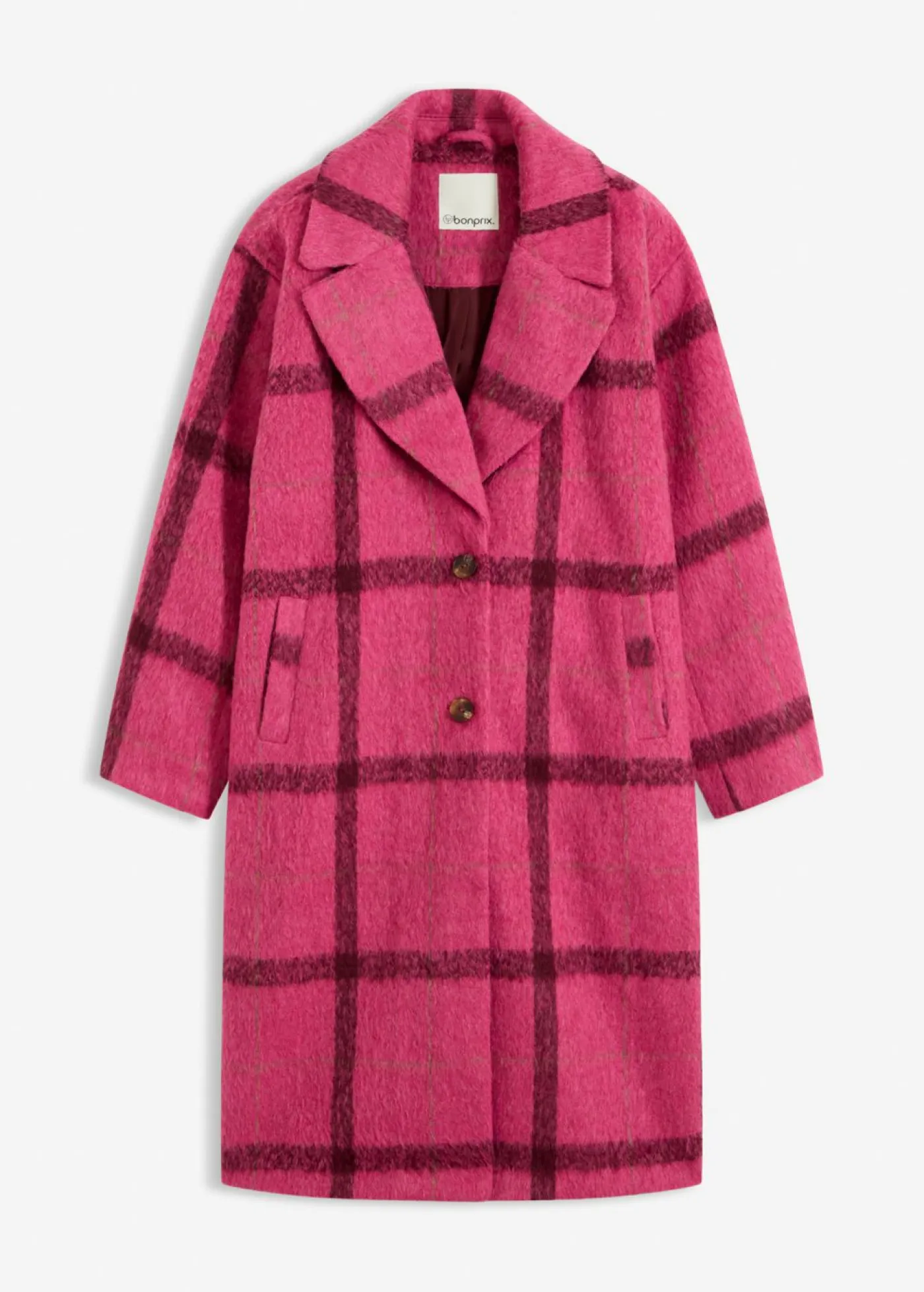 Abrigo moderno con aspecto de lana, corte ligeramente holgado y cierre con botones en la parte delantera.