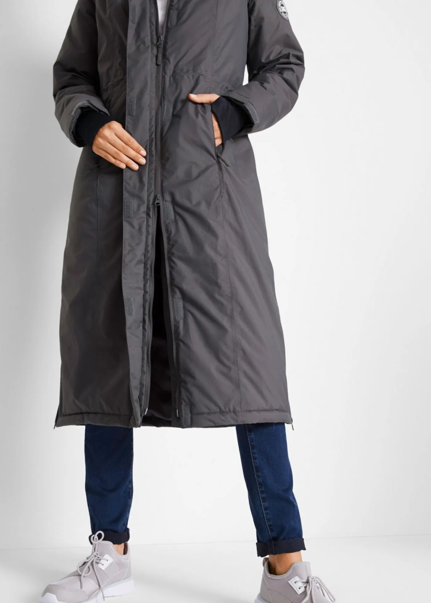 Chaquetón funcional de ancho ajustable con capucha desmontable y piel. Bolsillo interior con función de cable, la piel y la capucha son desmontables, orificios para los pulgares, cremallera bidireccional con protección para la barbilla, cintura ajustable, columna de agua de 3000 mm. Largo de aprox. 120 cm en talla 42.