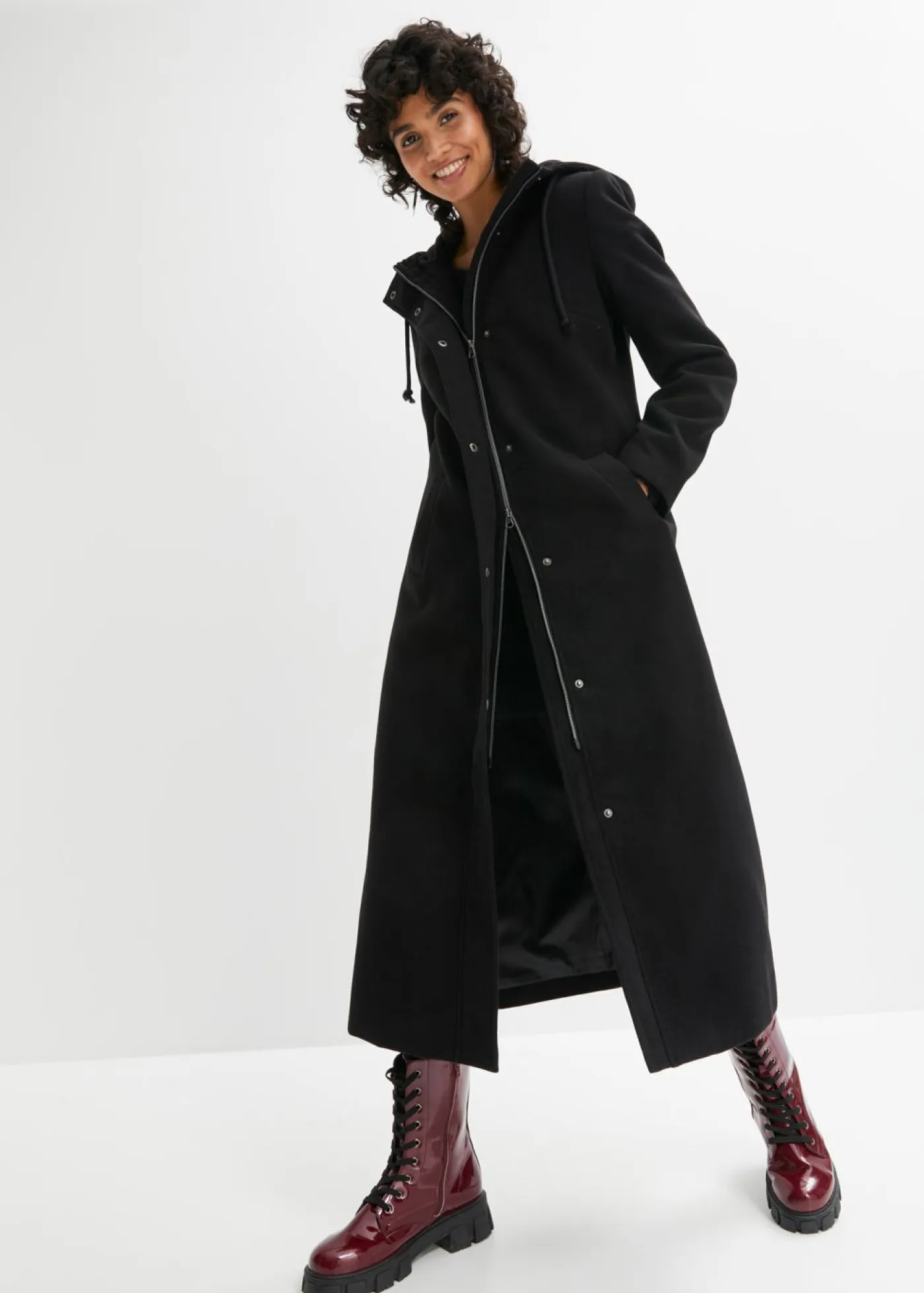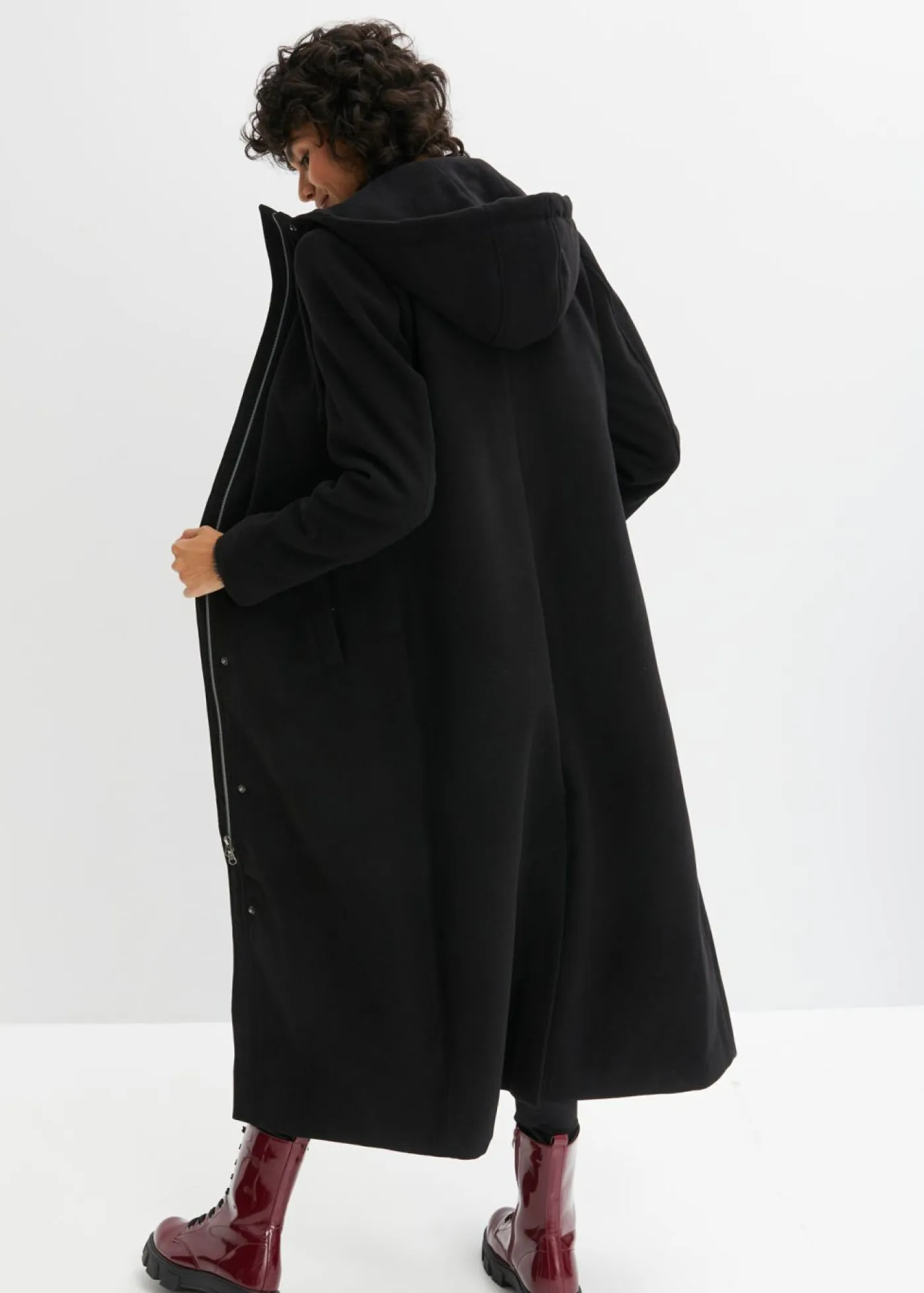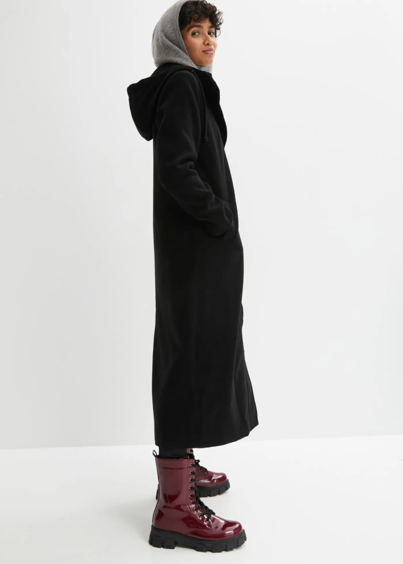 Abrigo largo informal en imitación de lana, con capucha y cordón de ajuste, bolsillos laterales. Largo total de aprox. 128 cm en todas las tallas. Se puede lavar a máquina.