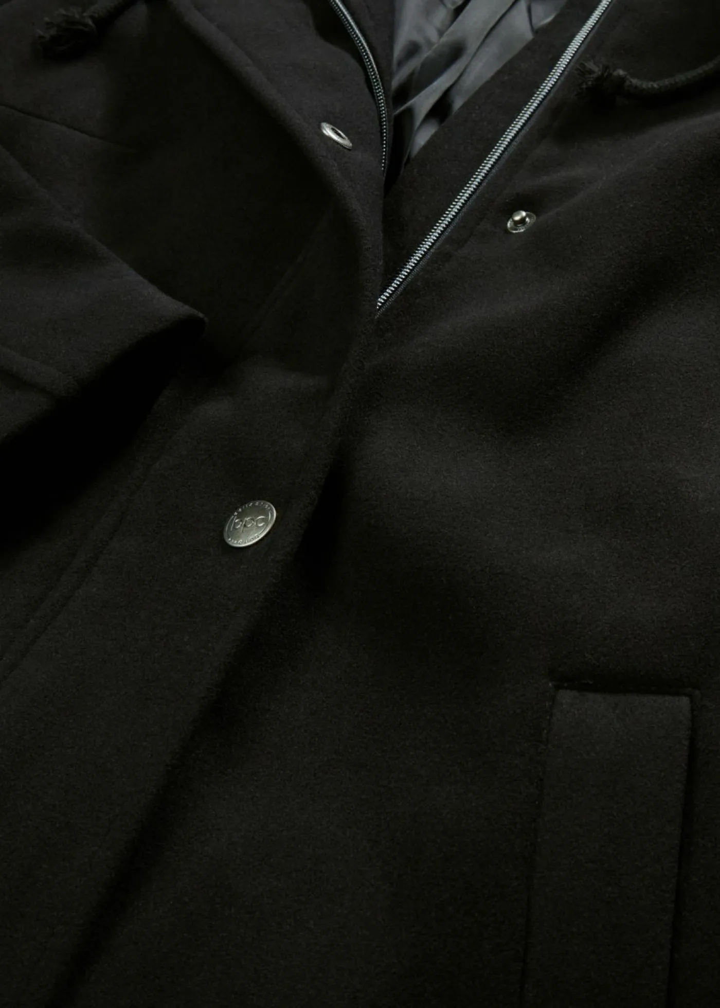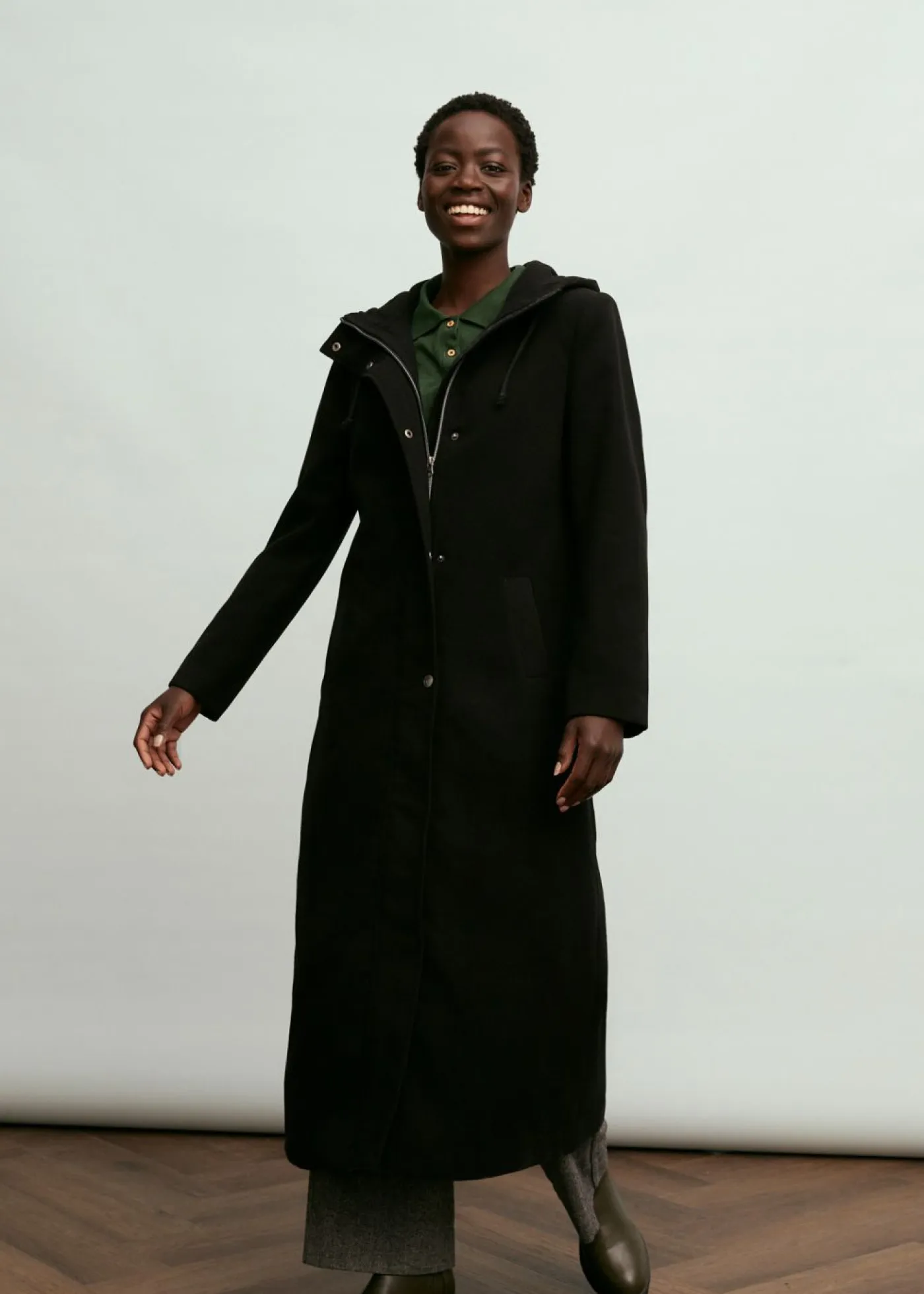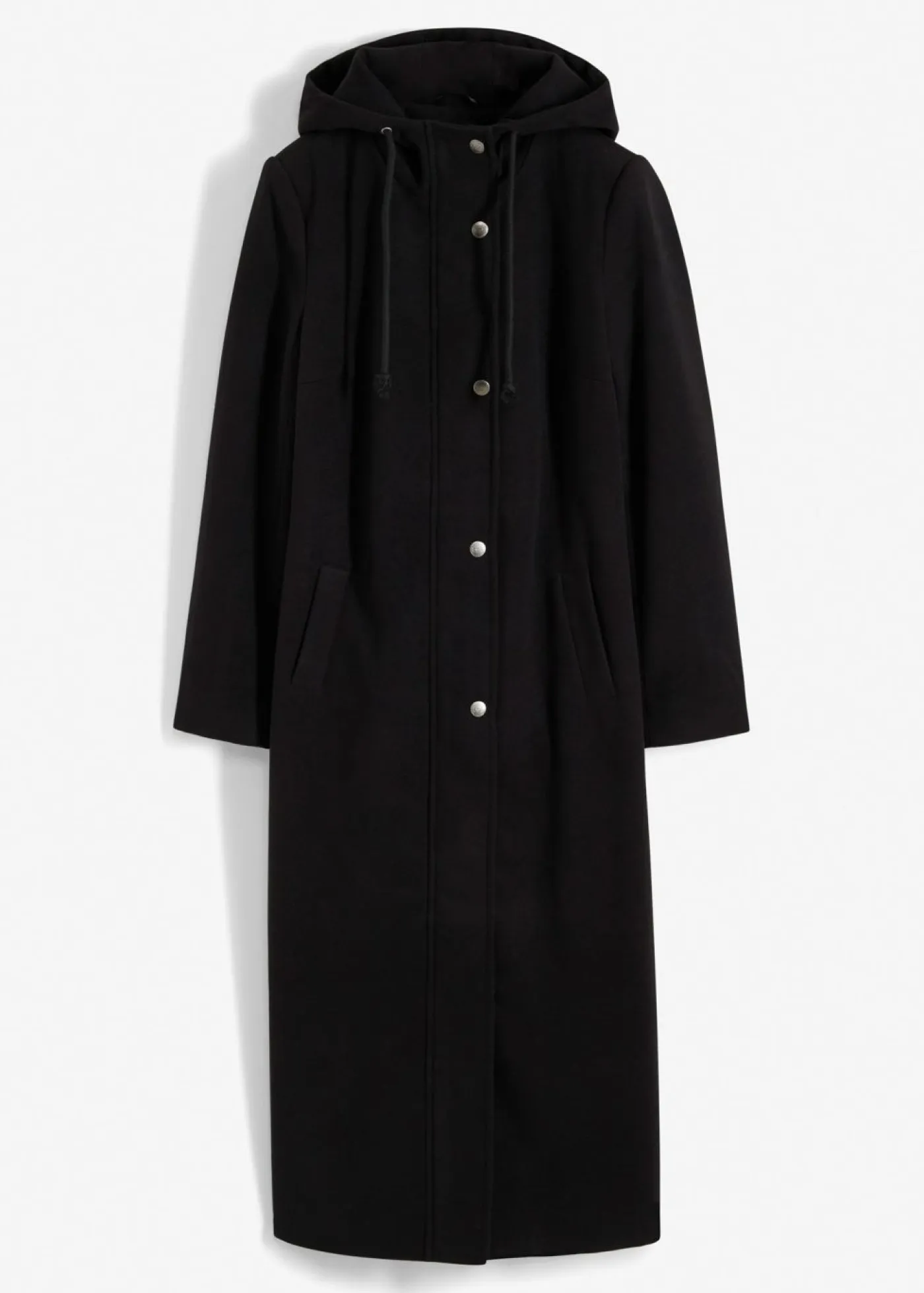 Abrigo largo informal en imitación de lana, con capucha y cordón de ajuste, bolsillos laterales. Largo total de aprox. 128 cm en todas las tallas. Se puede lavar a máquina.