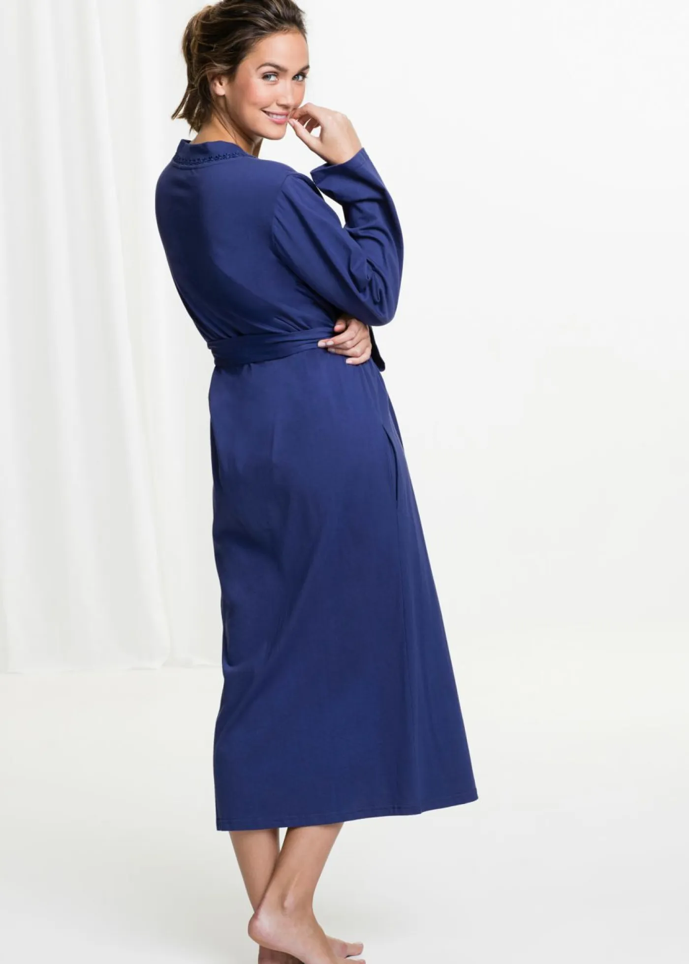 Albornoz suave con borde decorativo. Con cinturón y bolsillos.