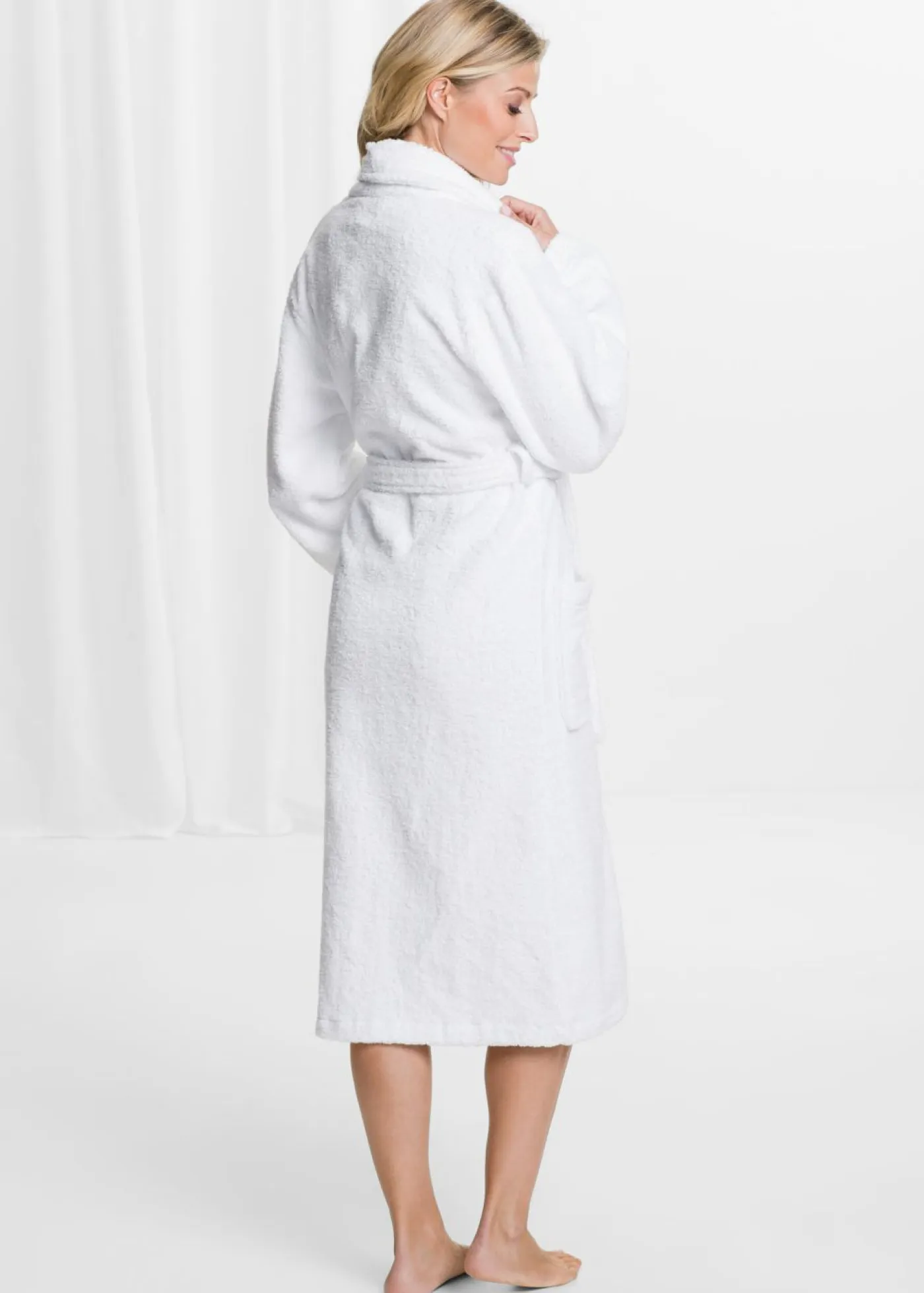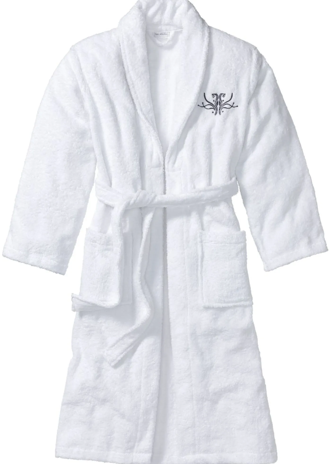 Albornoz suave pequeño bordado. El albornoz de rizo está hecho de algodón esponjoso y garantiza una sensación acogedora. Este atractivo modelo tiene un corte clásico con un lazo para sujetarlo y dos bolsillos de parche en la parte delantera. El pequeño bordado junto al cuello añade un elegante acento. El albornoz presenta un corte favorecer para acompañarte en la sauna.
