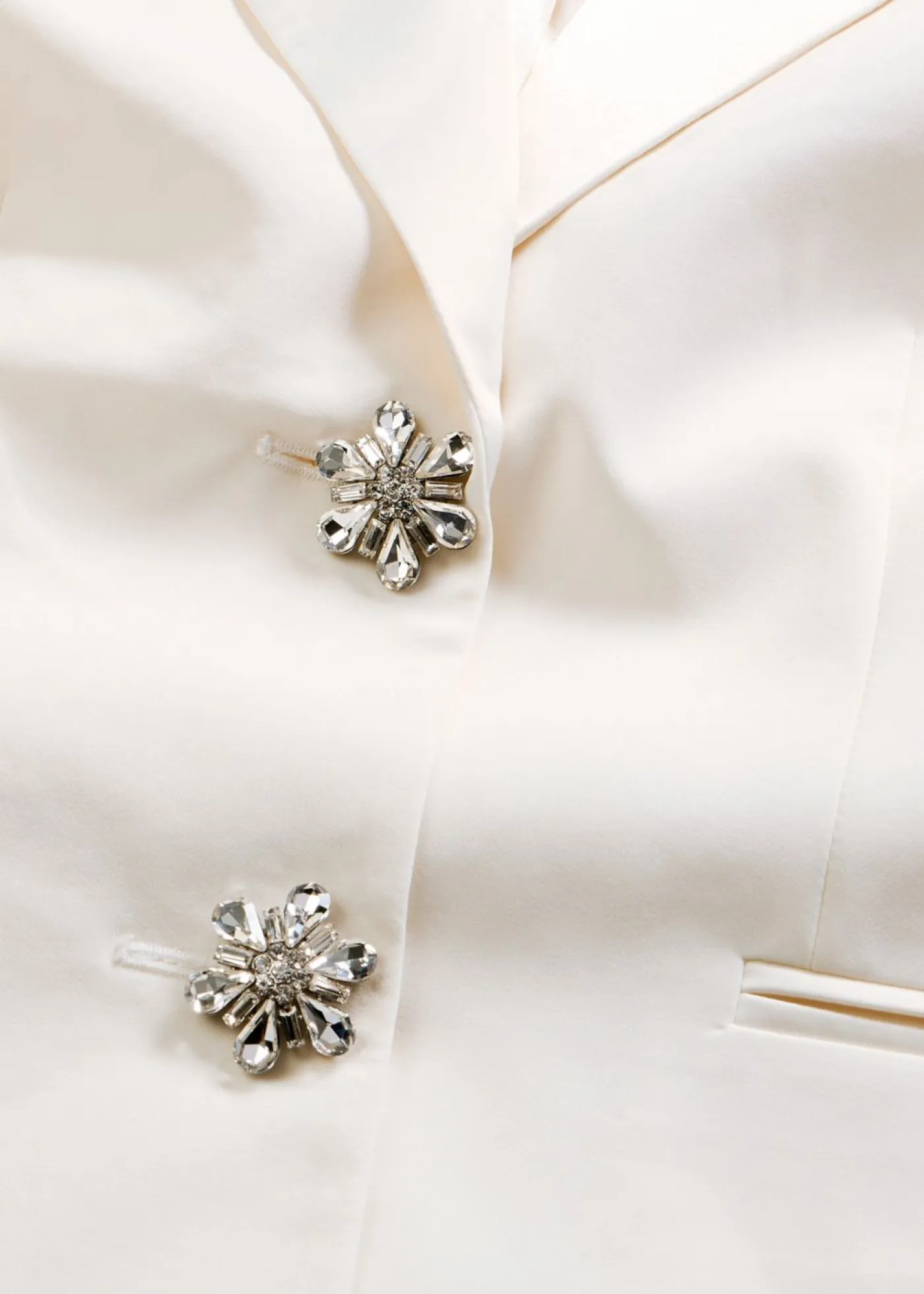 Moderna y femenina: americana con cuello de satén y botones decorativos.