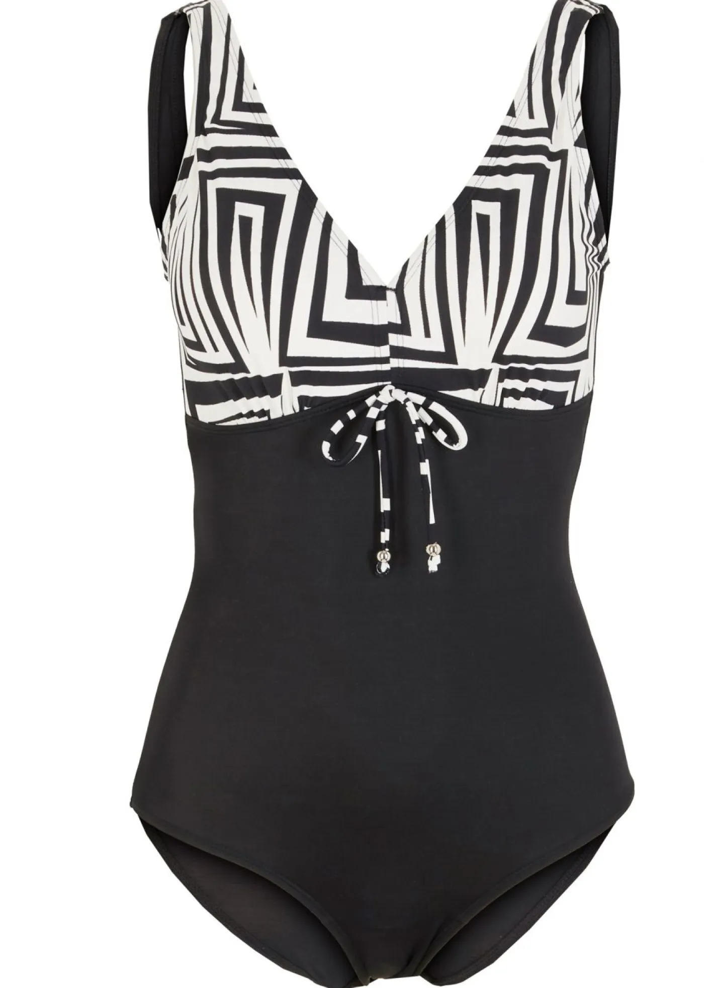Bañador llamativo con lazo y un bonito estampado. Bañador de una pieza con cuello de pico y copas con diseño geométrico. Copas suaves, forro en el busto y franja elástica bajo el busto para mayor soporte. Protege tu piel del sol.