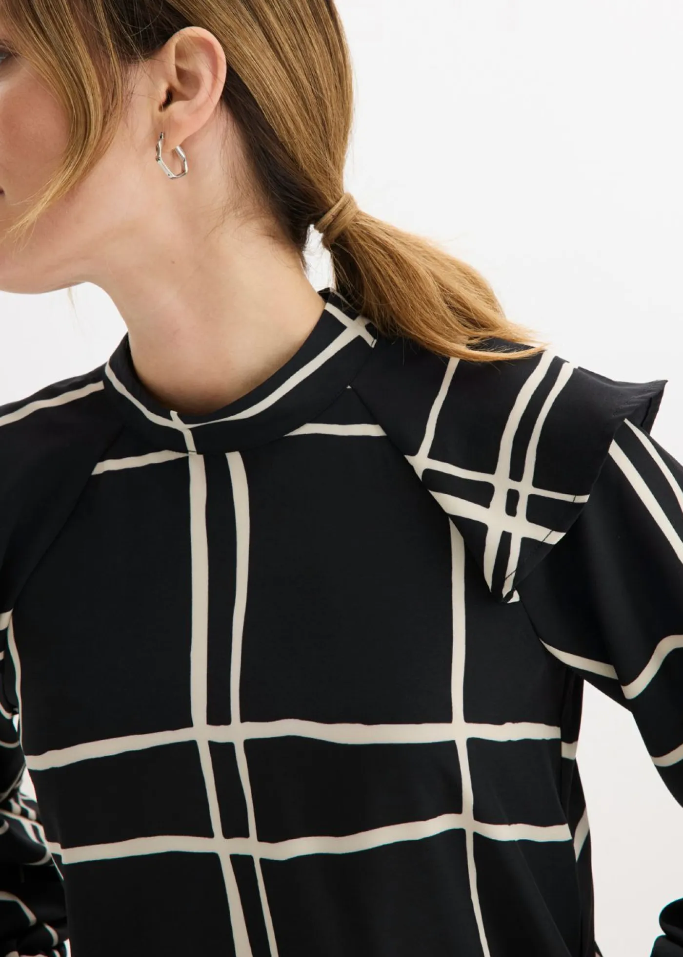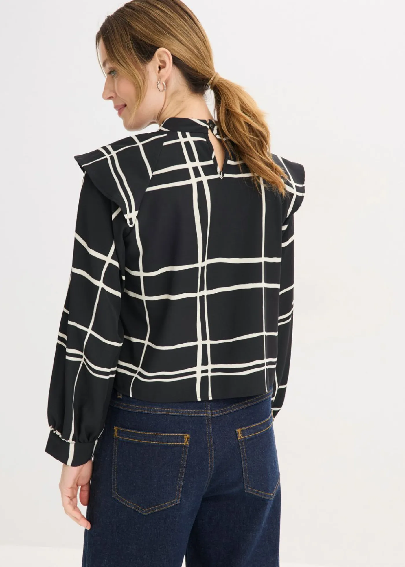 Blusa con estampado moderno, cuello alto y botones en la parte posterior.