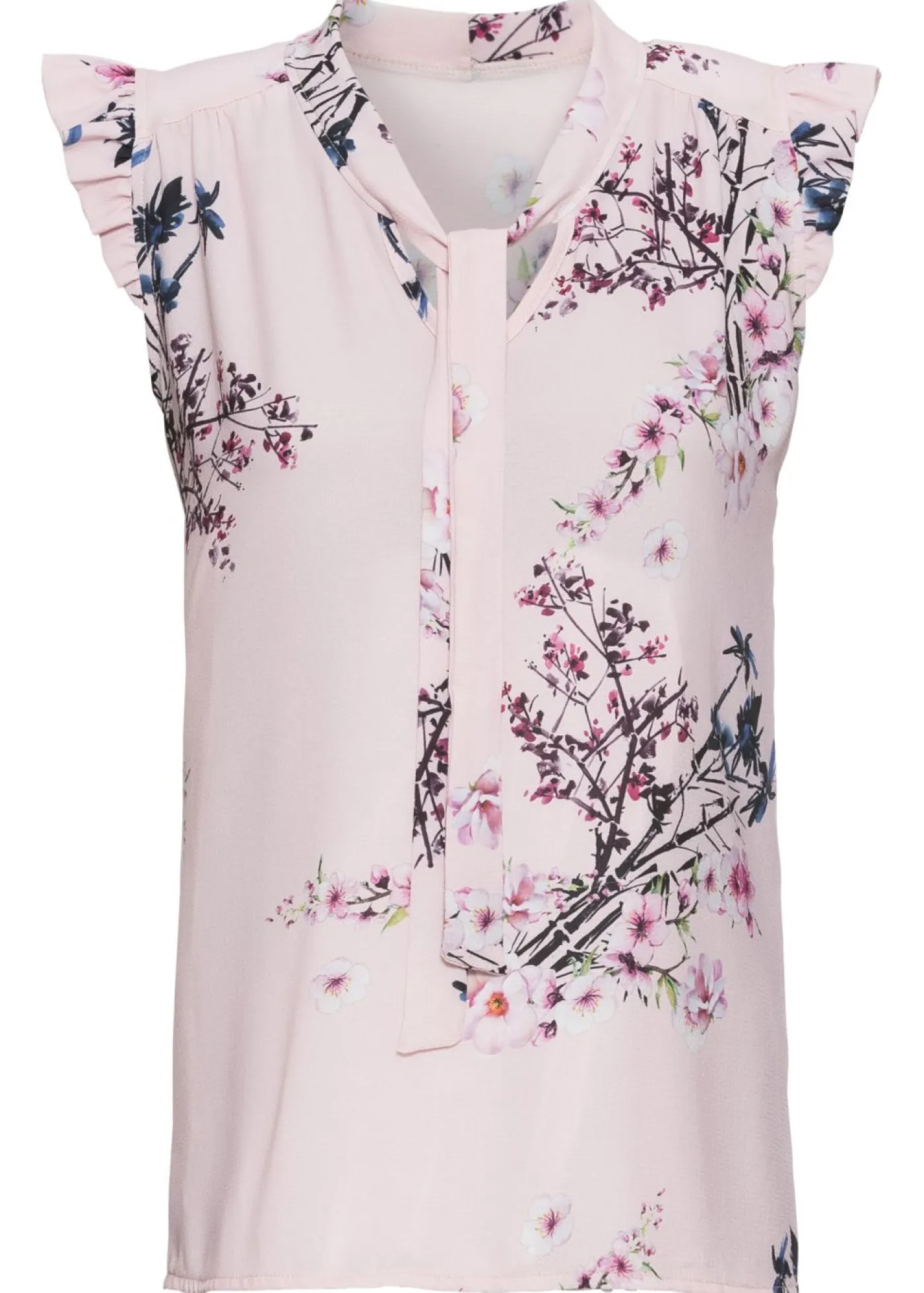 Elegante blusa con lazo, estampado y mangas cortas con volantes. Esta bonita blusa de la marca Bodyflirt destaca especialmente por sus dos estampados diferentes, los volantes en las mangas y el lazo en el escote. Largo de aprox. 62 cm en talla 38.