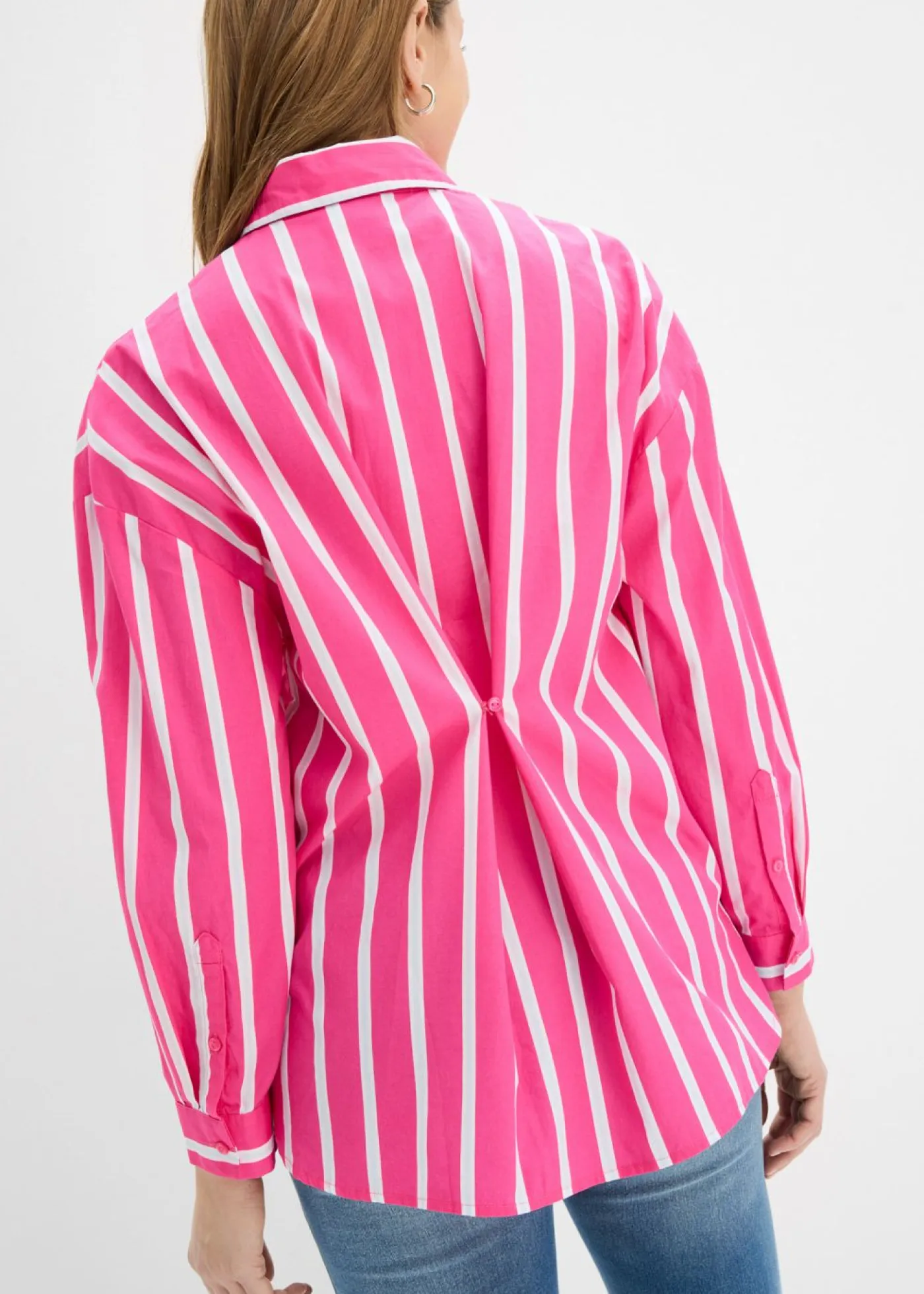 Blusa oversize de manga larga, con botones y cuello clásico. Con detalle ajustable en la espalda para regular el ancho. Largo de aprox. 56 cm en talla 42. Se puede lavar a máquina.