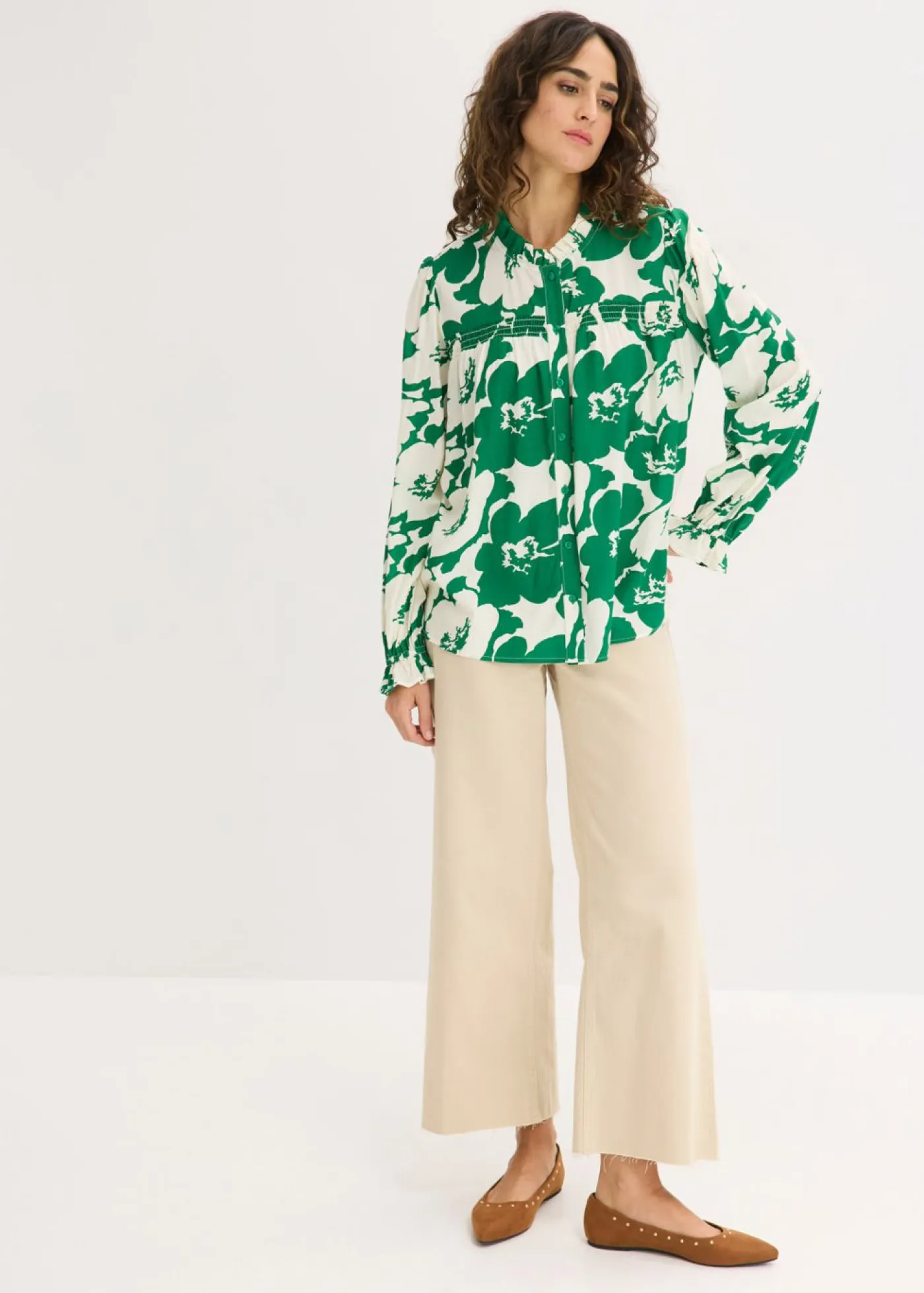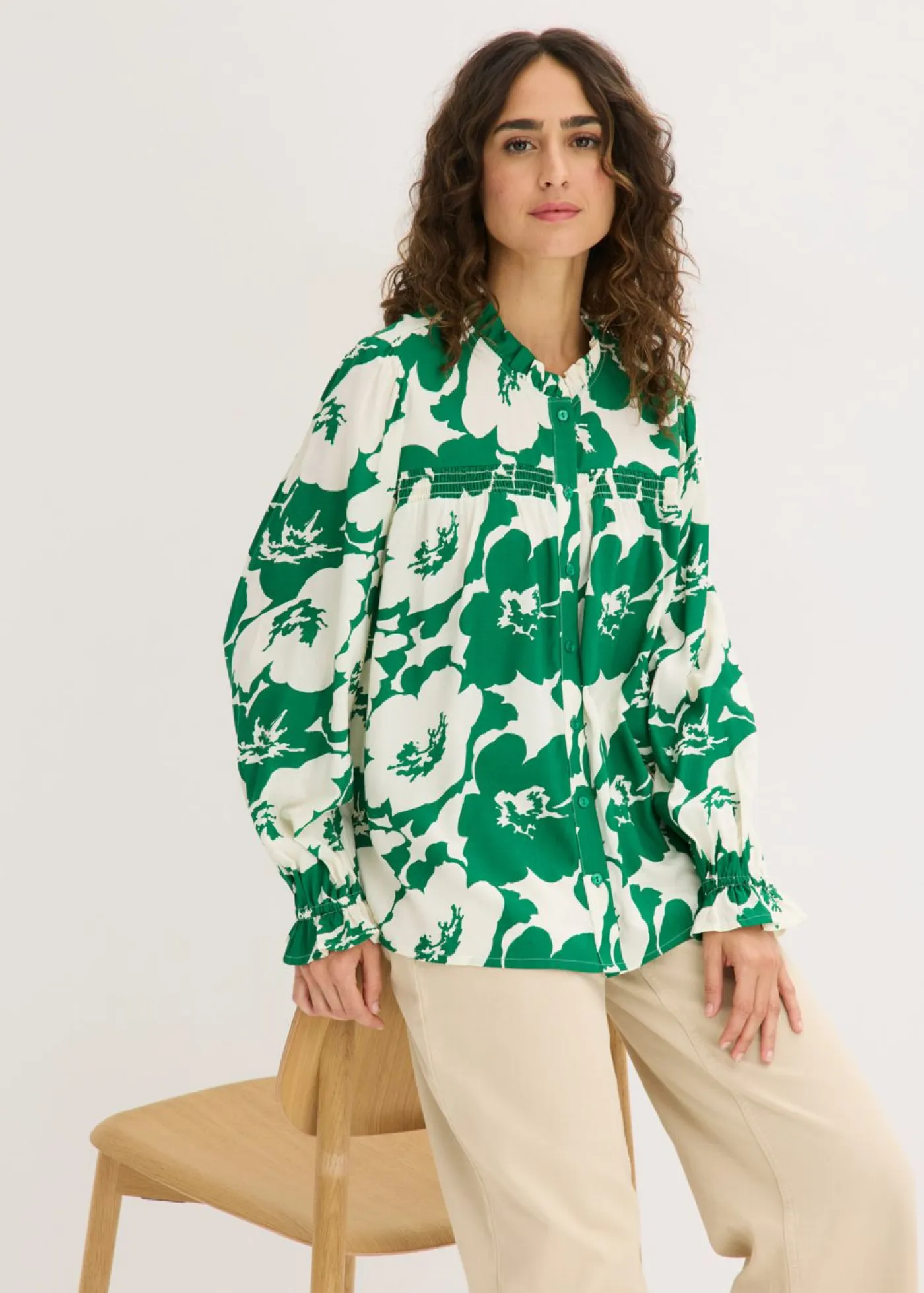 Blusa femenina de viscosa fluida con botones en la parte delantera y pequeño volante en el escote.