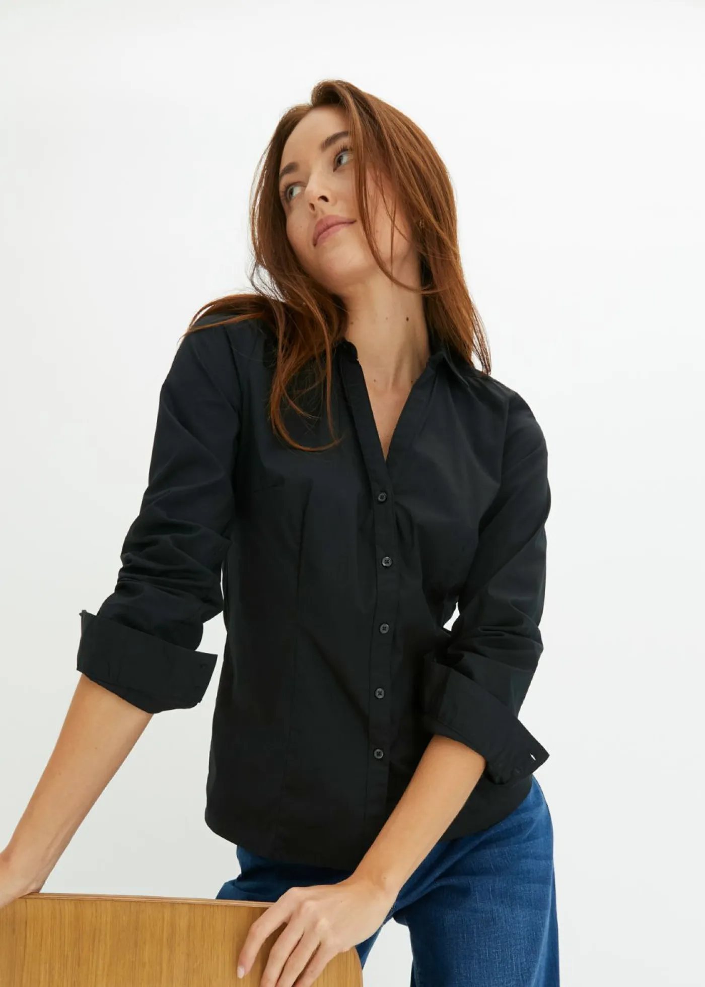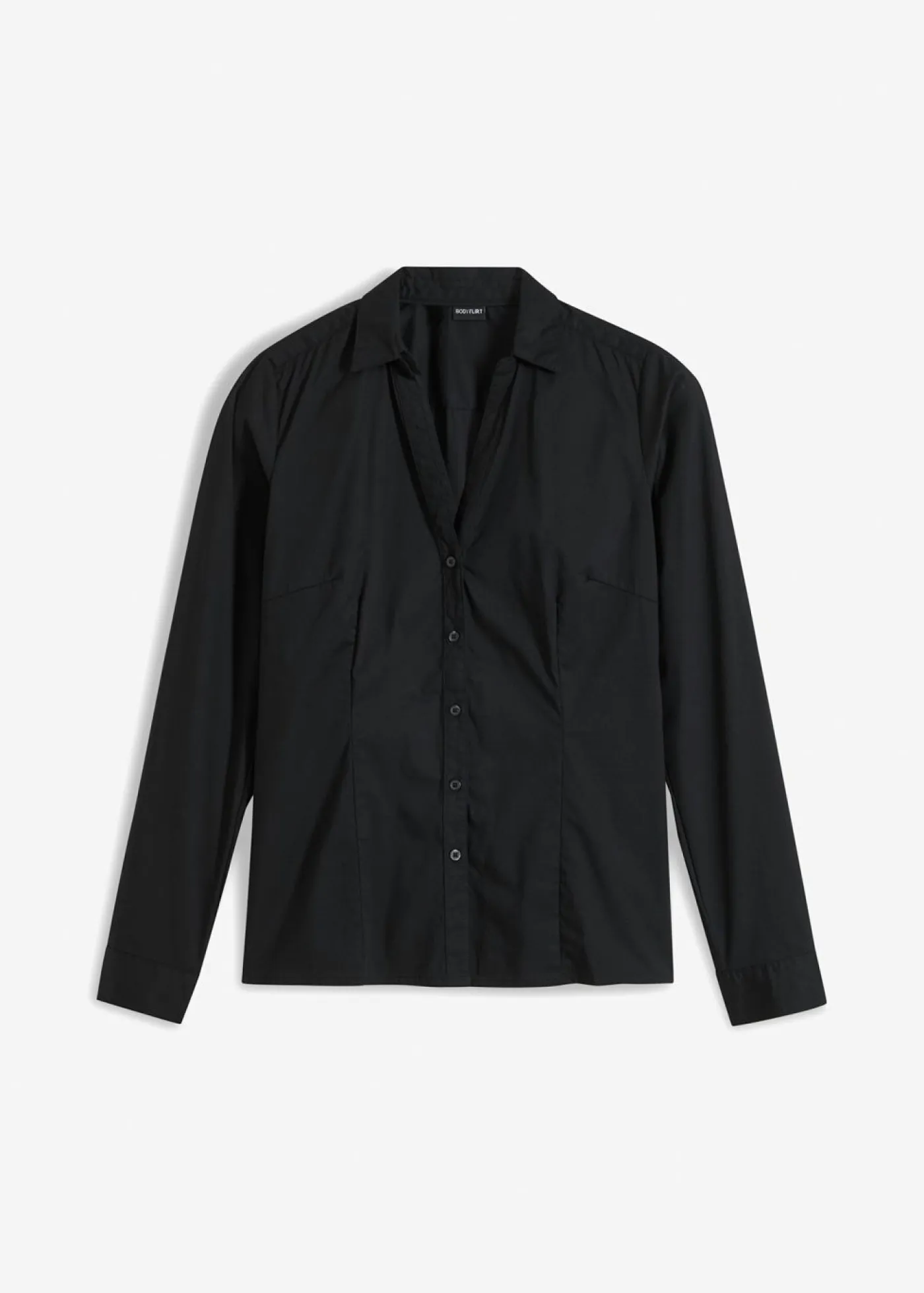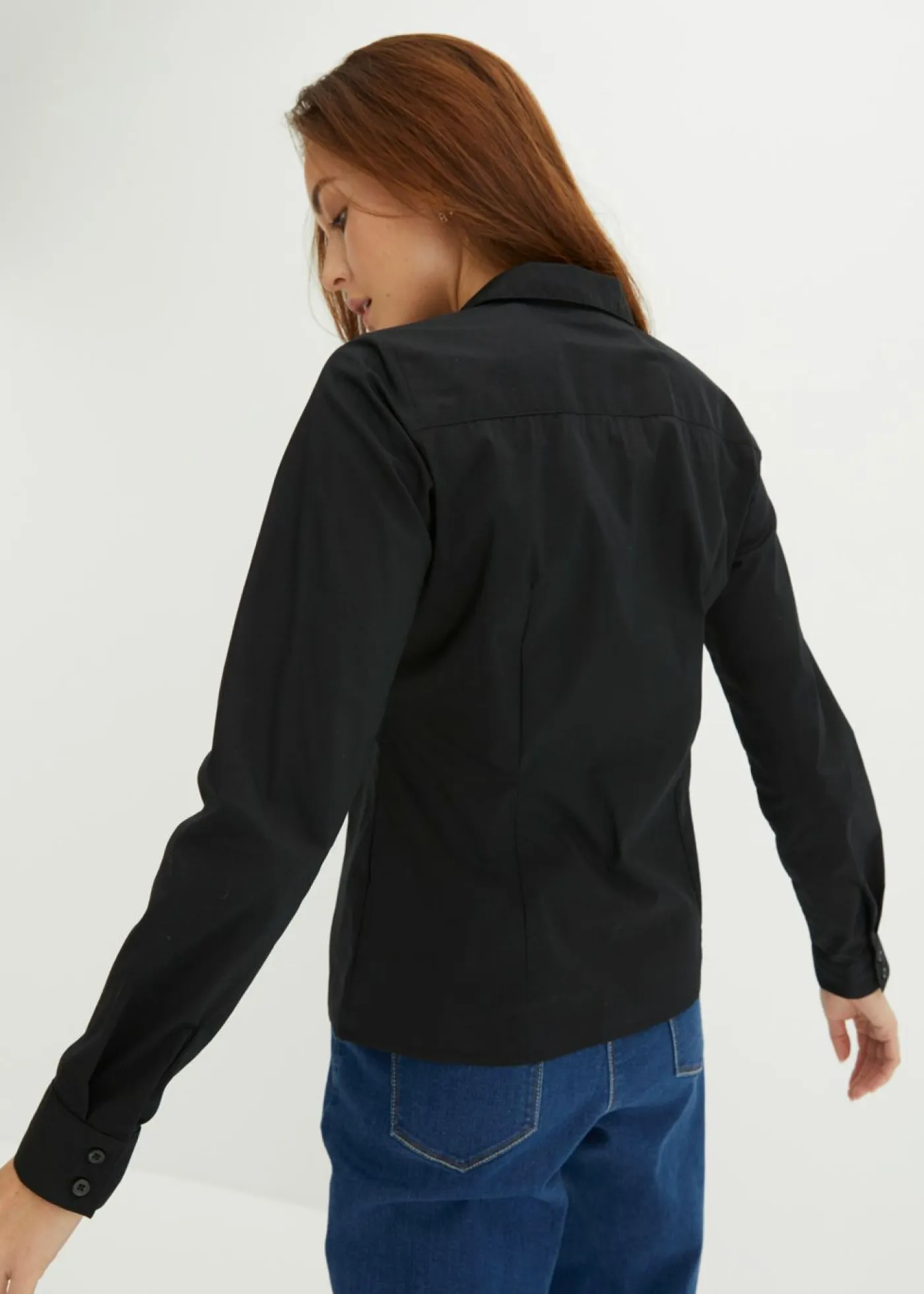 Blusa elástica versátil de manga larga. Blusa elástica con escote en V y dos botones en el dobladillo de las mangas. Largo de aprox. 62 cm en talla 38.