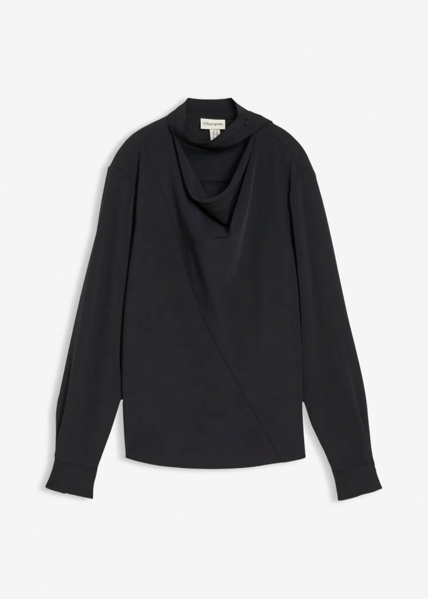 Blusa ligeramente brillante con escote en cascada y detalle ajustable en el cuello.