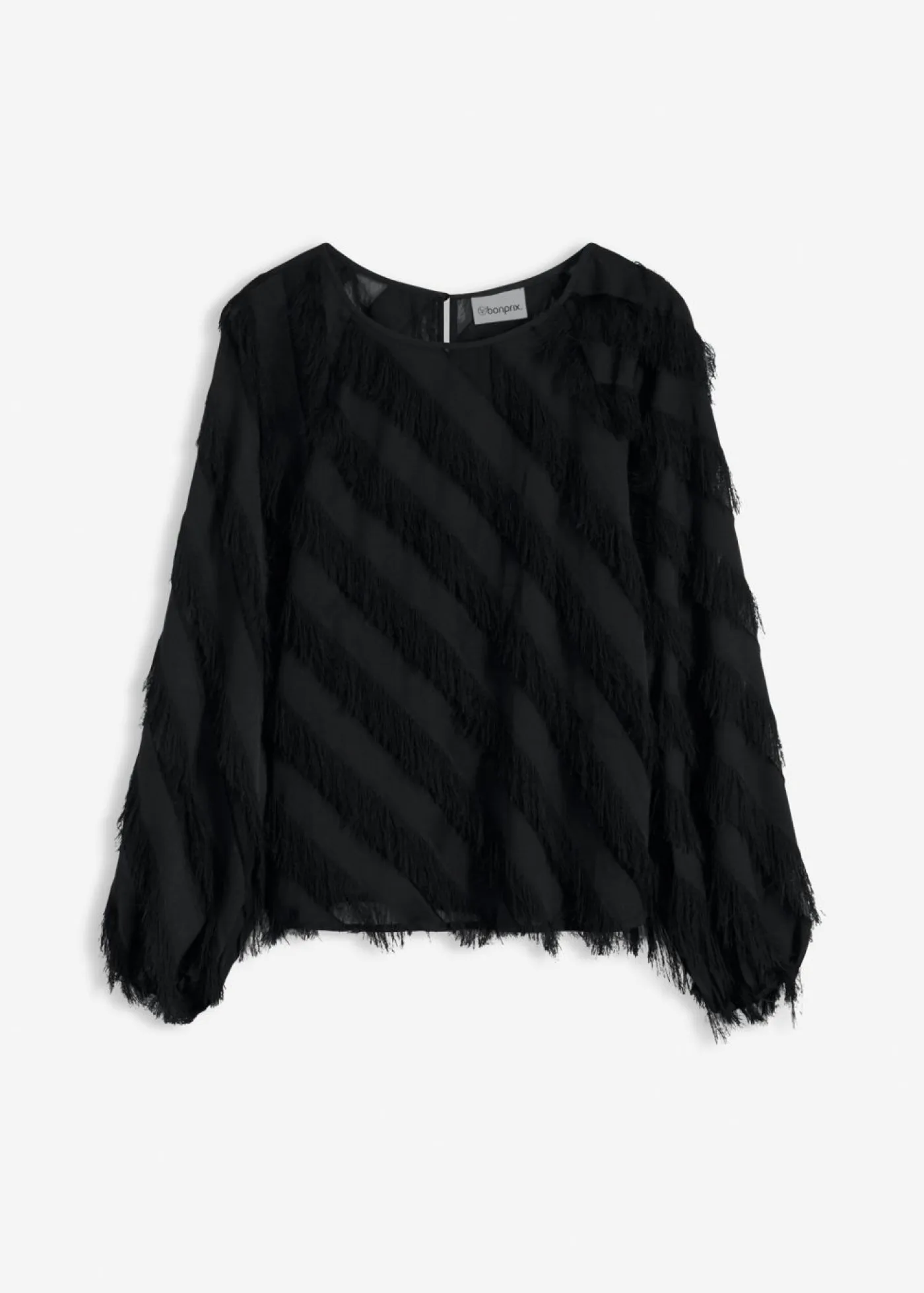 Blusa moderna con detalles decorativos de flecos en el material.