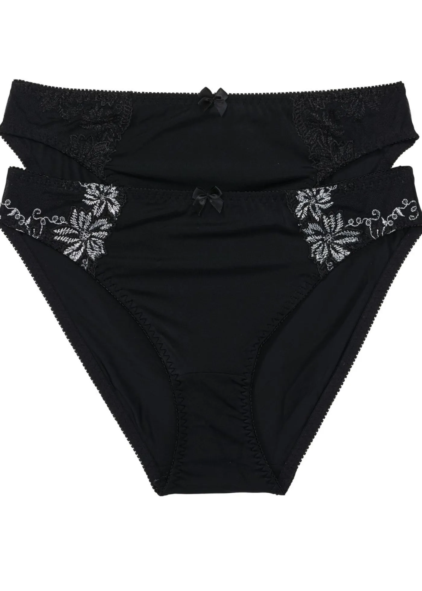 Bonitas braguitas en un paquete doble. Un bonito bordado decora estas braguitas. La parte posterior irradia sobriedad. El refuerzo está hecho de algodón.