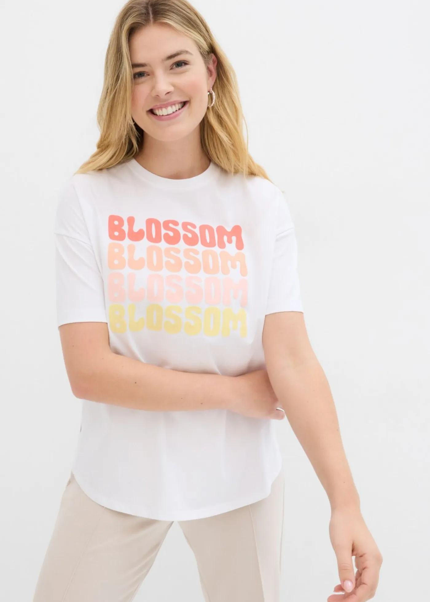 Camiseta ancha de manga corta con estampado en el pecho. Largo de aprox. 66 cm en talla 40/42. Se puede lavar a máquina.