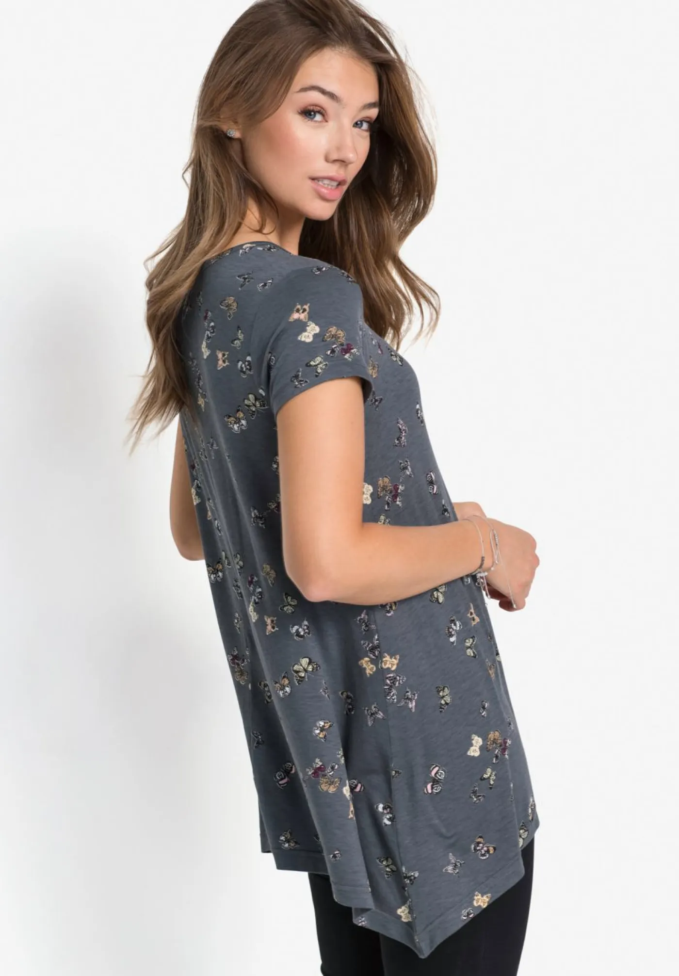 Camisa dulce de manga corta con dobladillo puntiagudo. Ligeramente acampanada con los laterales más largos. Largo de aprox. 70 cm en talle 40/42.