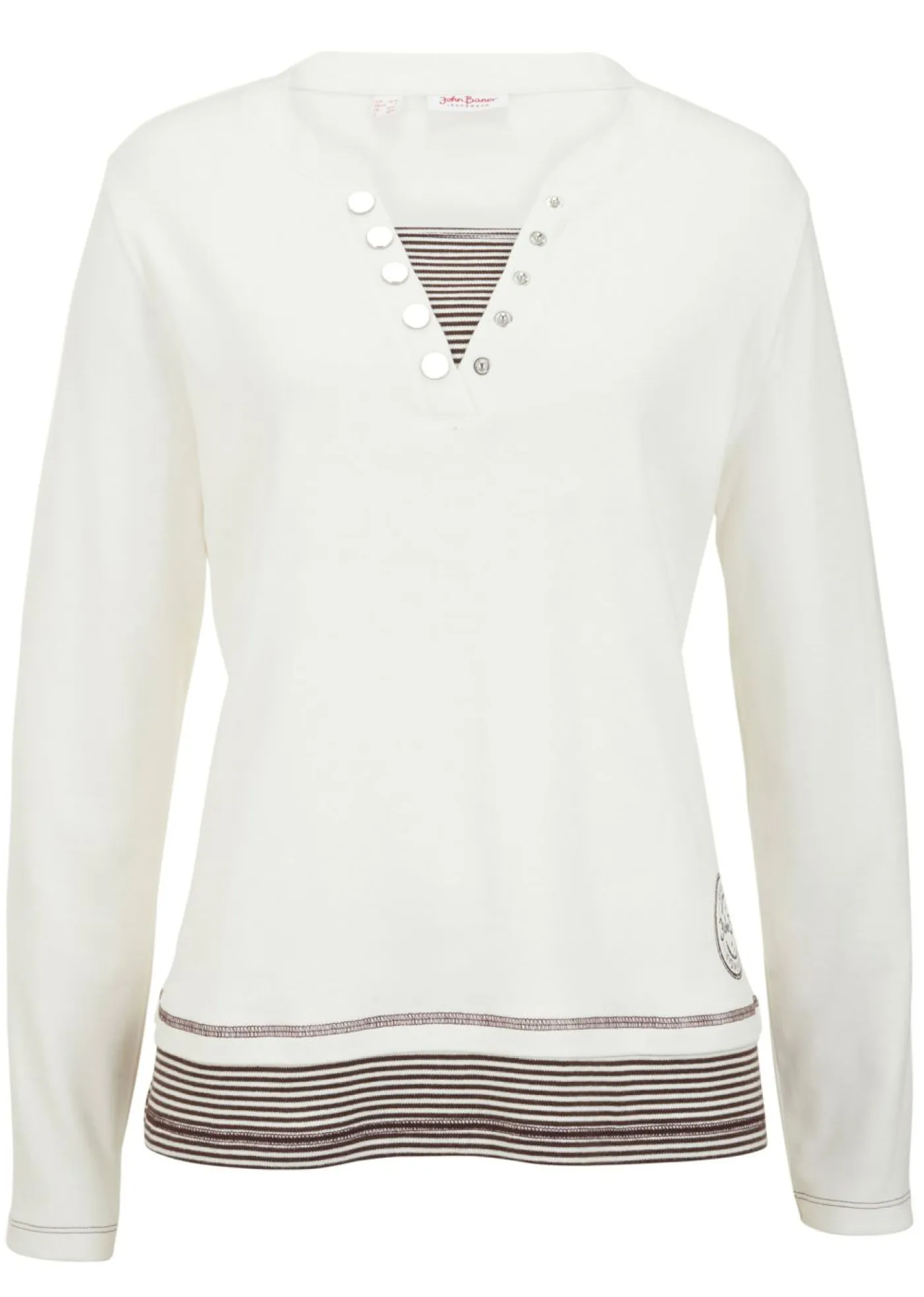 Camiseta de manga larga de algodón, marinera, look 2 en 1. Largo total de aprox. 66 cm en talla 40/42. Se puede lavar a máquina.