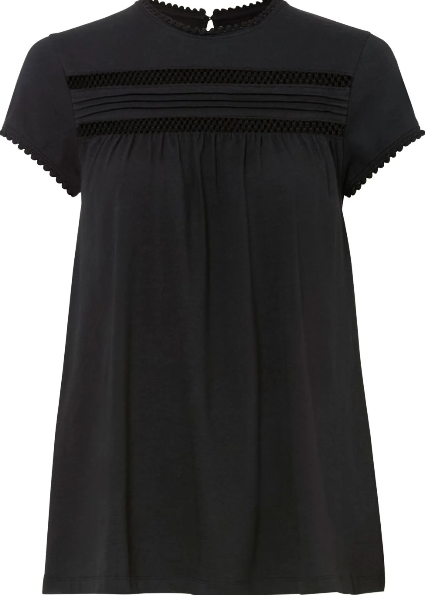 Moderna camiseta de algodón con inserto de encaje y manga corta. Largo de aprox. 70 cm en talla 42. Se puede lavar a máquina.