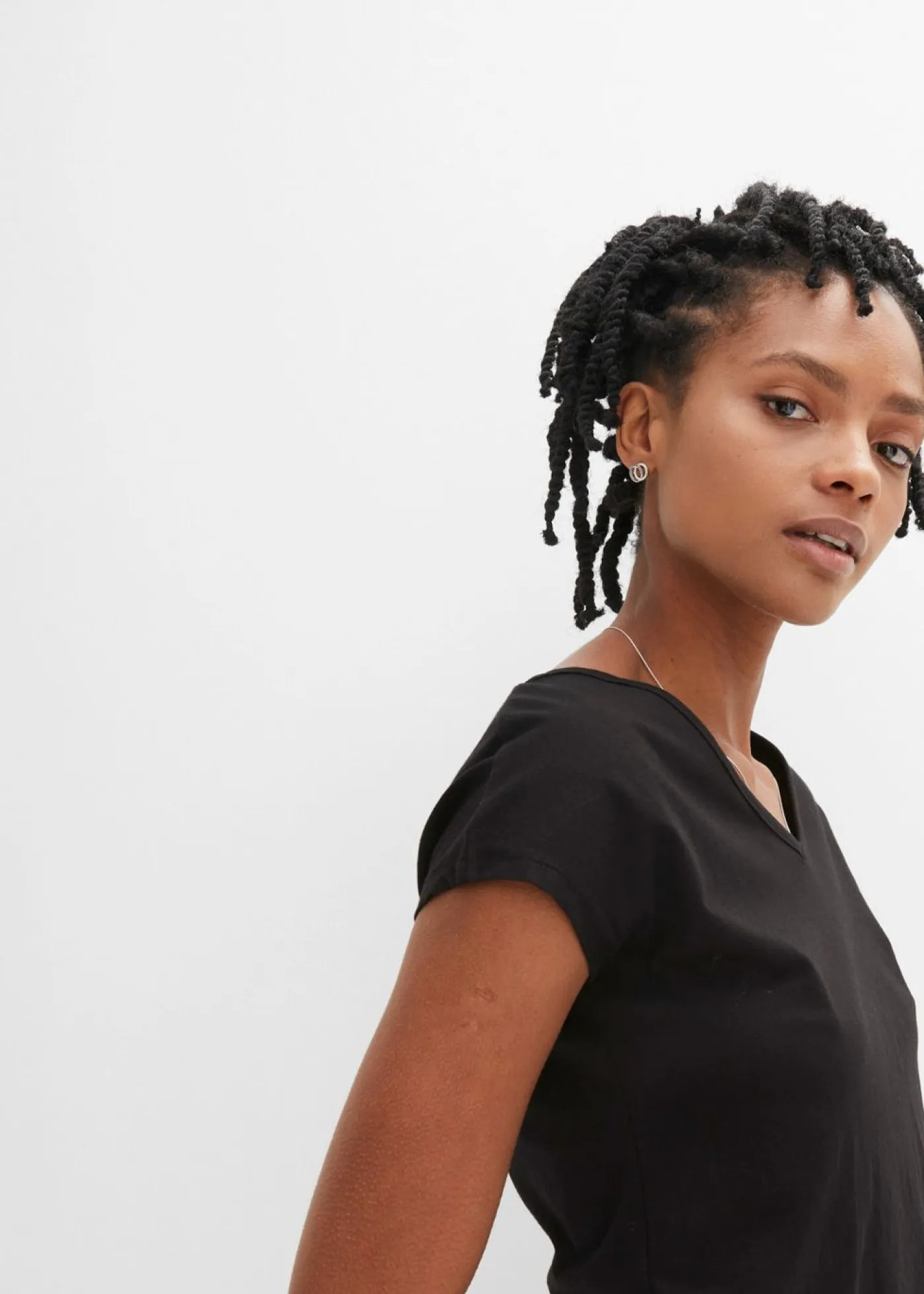 Elegante camiseta de manga corta con escote en V y un moderno detalle en la parte posterior. Y cuello en V. Largo de aprox. 64 cm en talla 36/38.