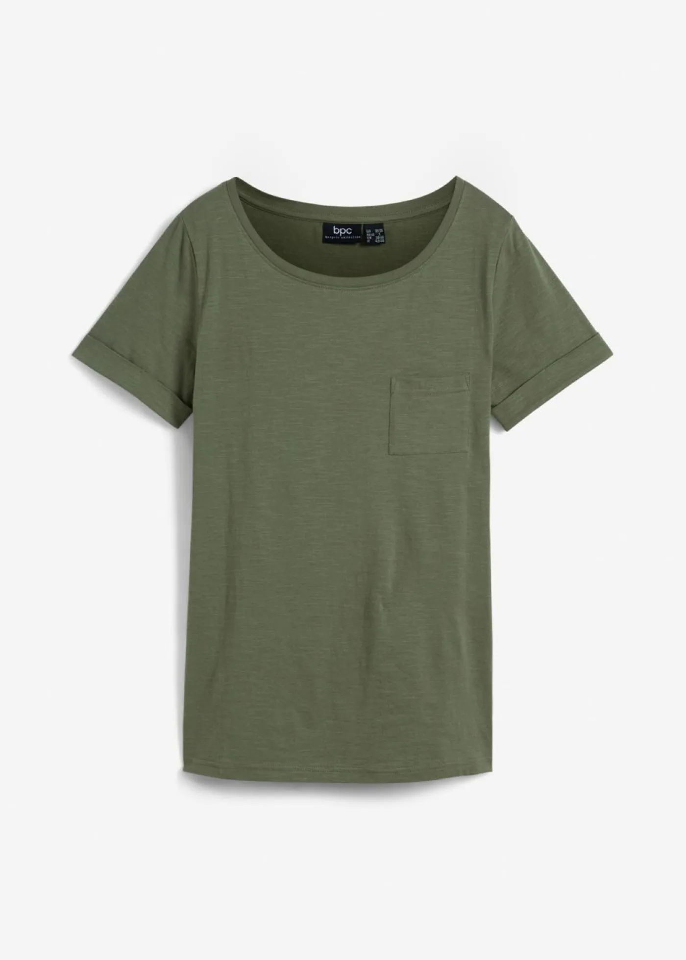 Camiseta de hilo flameado de algodón orgánico con bolsillo decorativo en el pecho. Largo de aprox. 68 cm (talla 36/38) a aprox. 78 cm (talla 56/58). Se puede lavar a máquina.