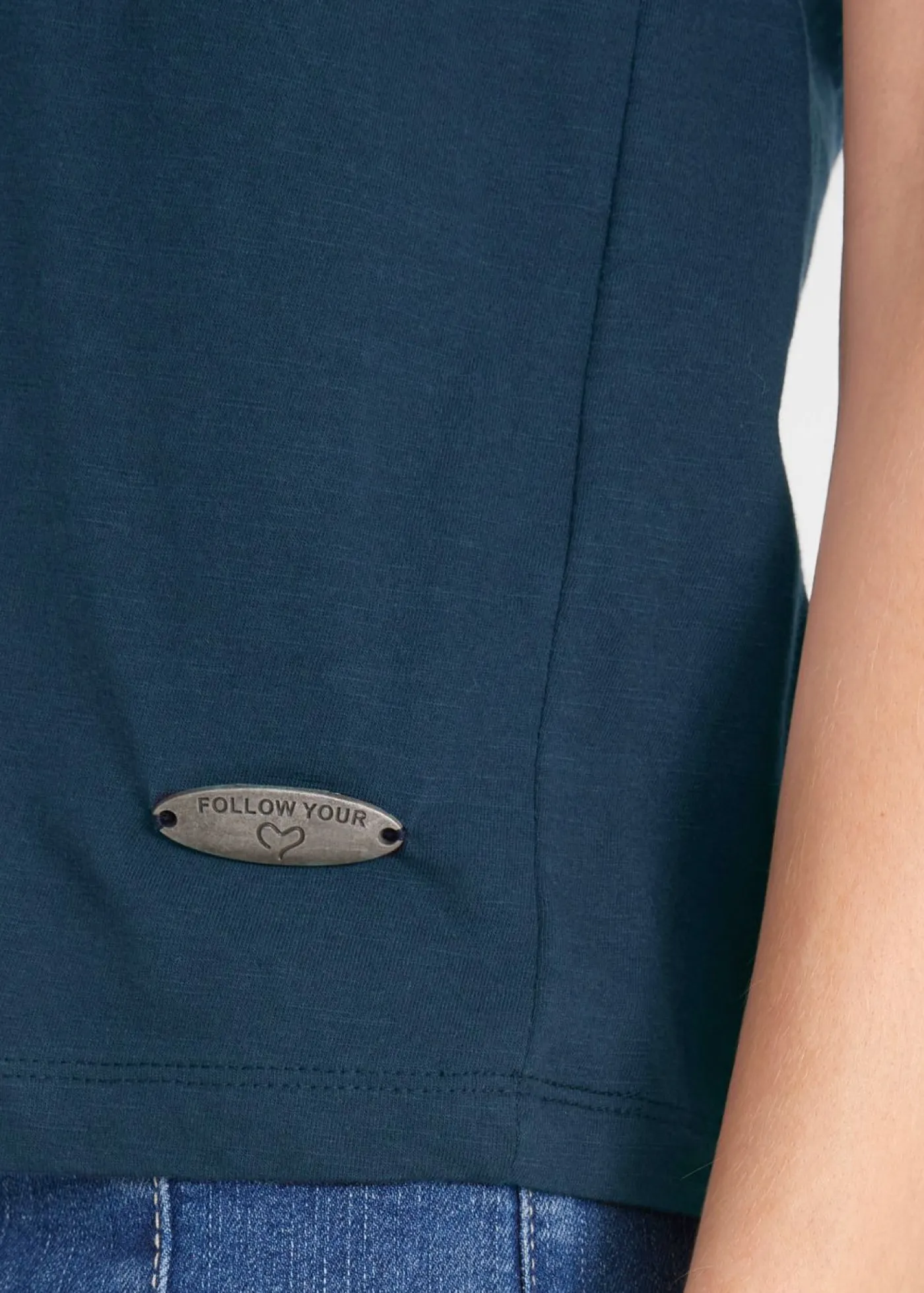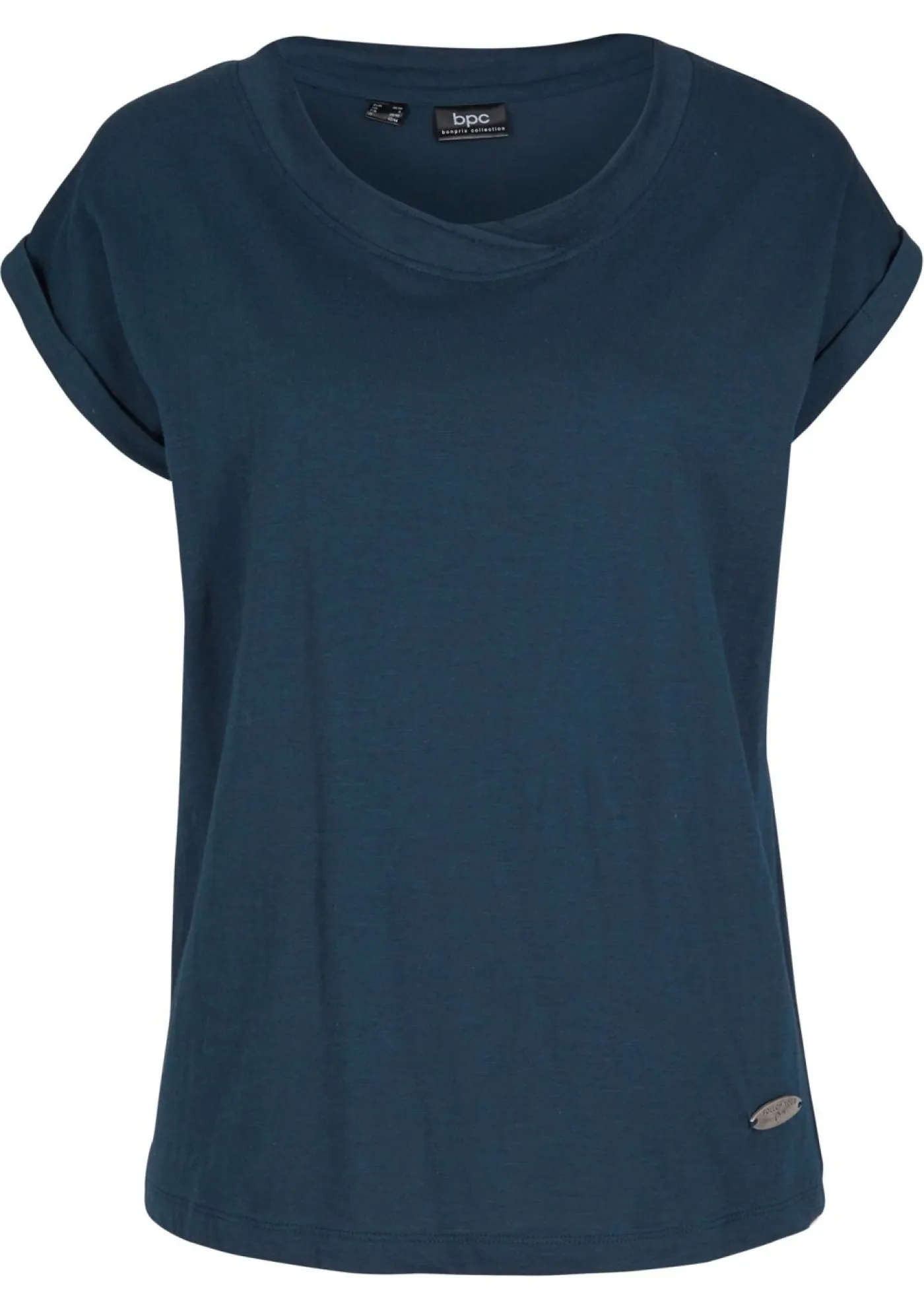 Bonita camiseta de algodón con mangas de murciélago y detalle en el escote. Largo total de aprox. 66 cm en talla 40/42. Se puede lavar a máquina.