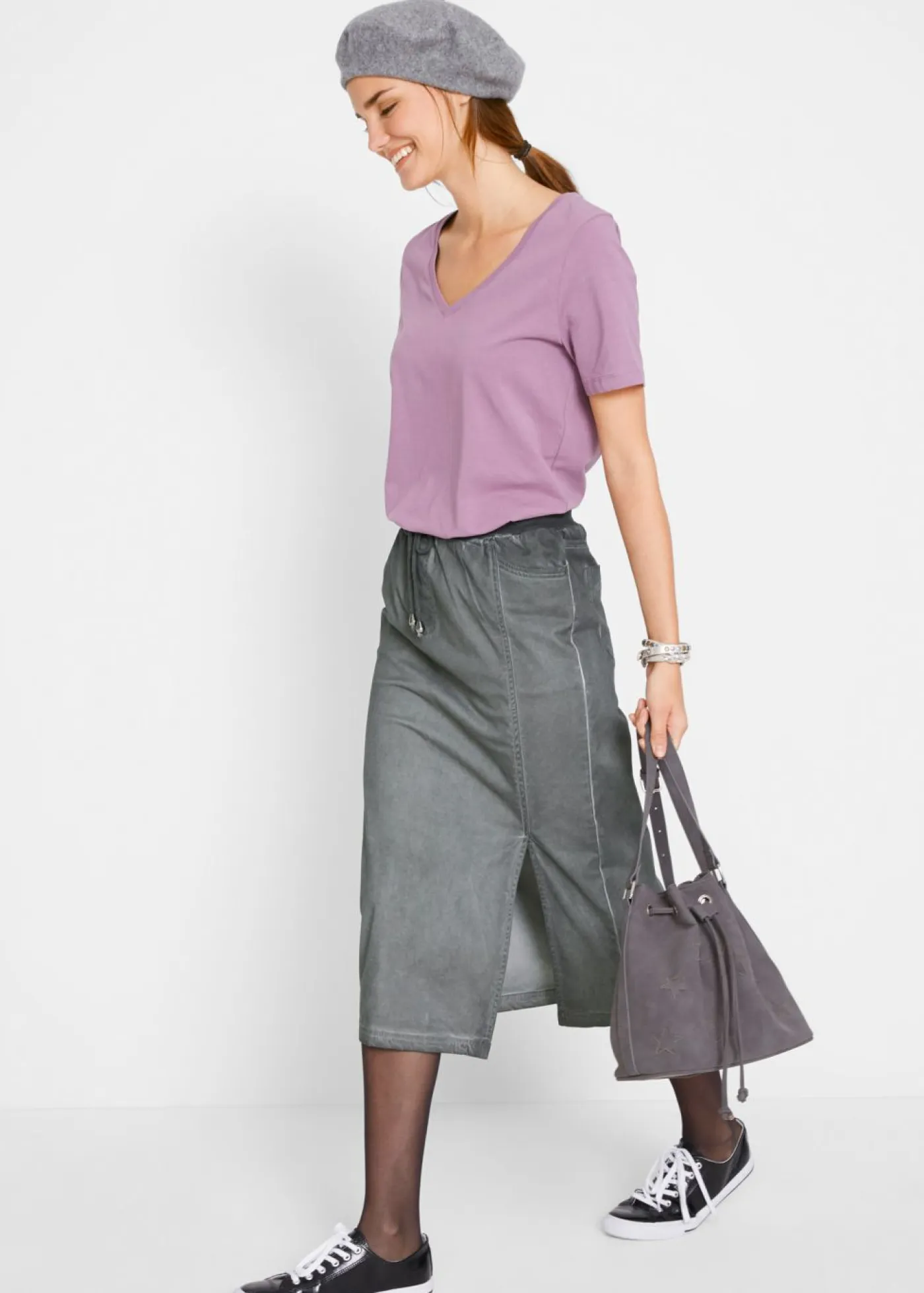 Camiseta con escote pronunciado en V y dobladillo redondo con aberturas laterales. Largo de aprox. 68 cm (talla 36/38) a 78 cm (talla 56/58). Se puede lavar a máquina.