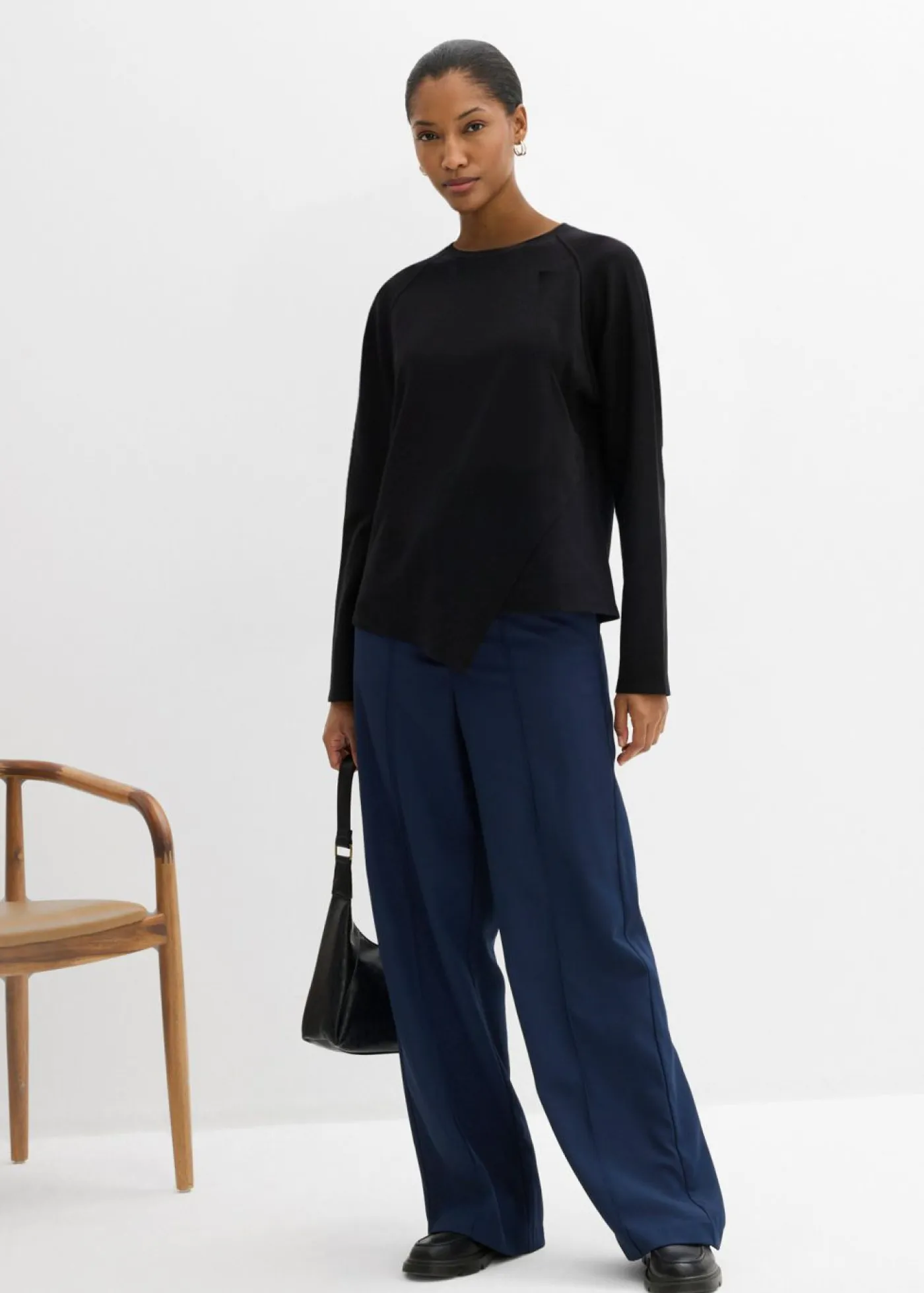 Camiseta de manga larga con cuello en cascada y dobladillo asimétrico.