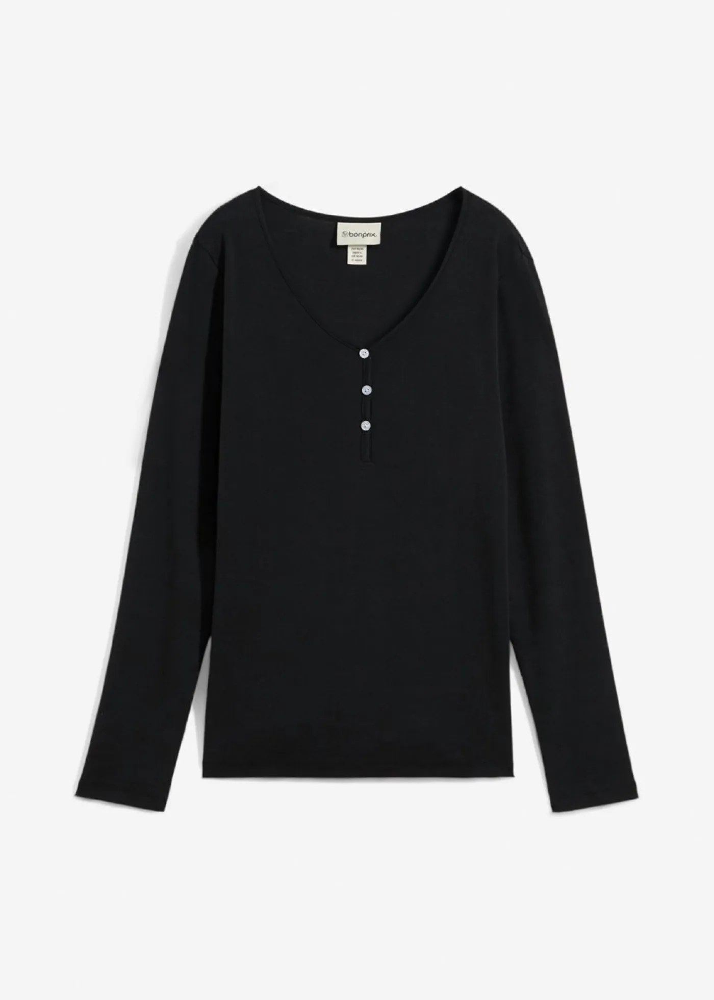 Camiseta de manga larga fácil de combinar. Cómoda camiseta de manga larga con botones en el escote en V confeccionada con algodón ecológico. Largo de aprox. 66 cm en talla 40/42. Se puede lavar a máquina.