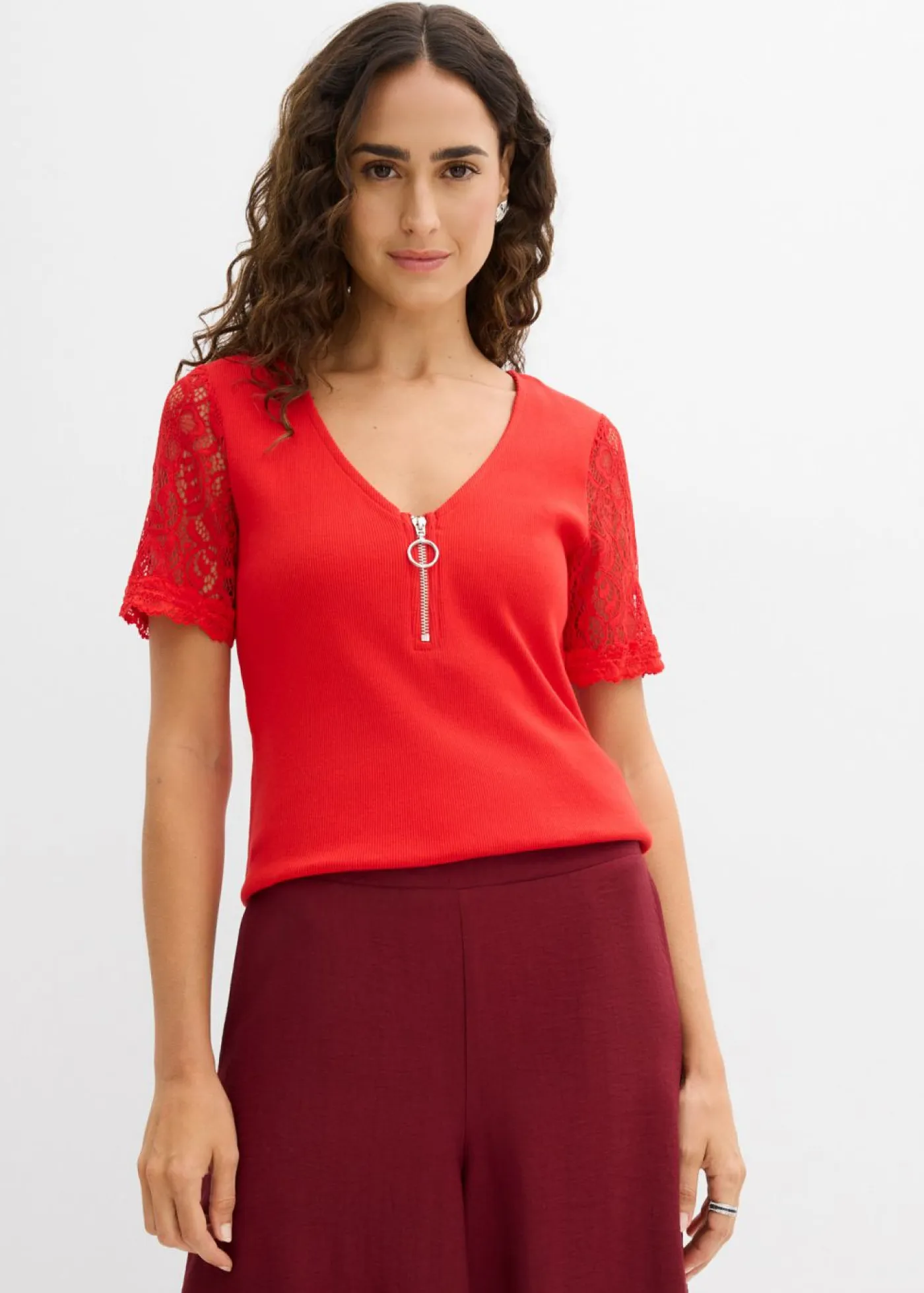 Bonita camiseta de corte ajustado y encaje. Moderna camiseta de canalé con cremallera. Largo de aprox. 64 cm en talla 36/38.
