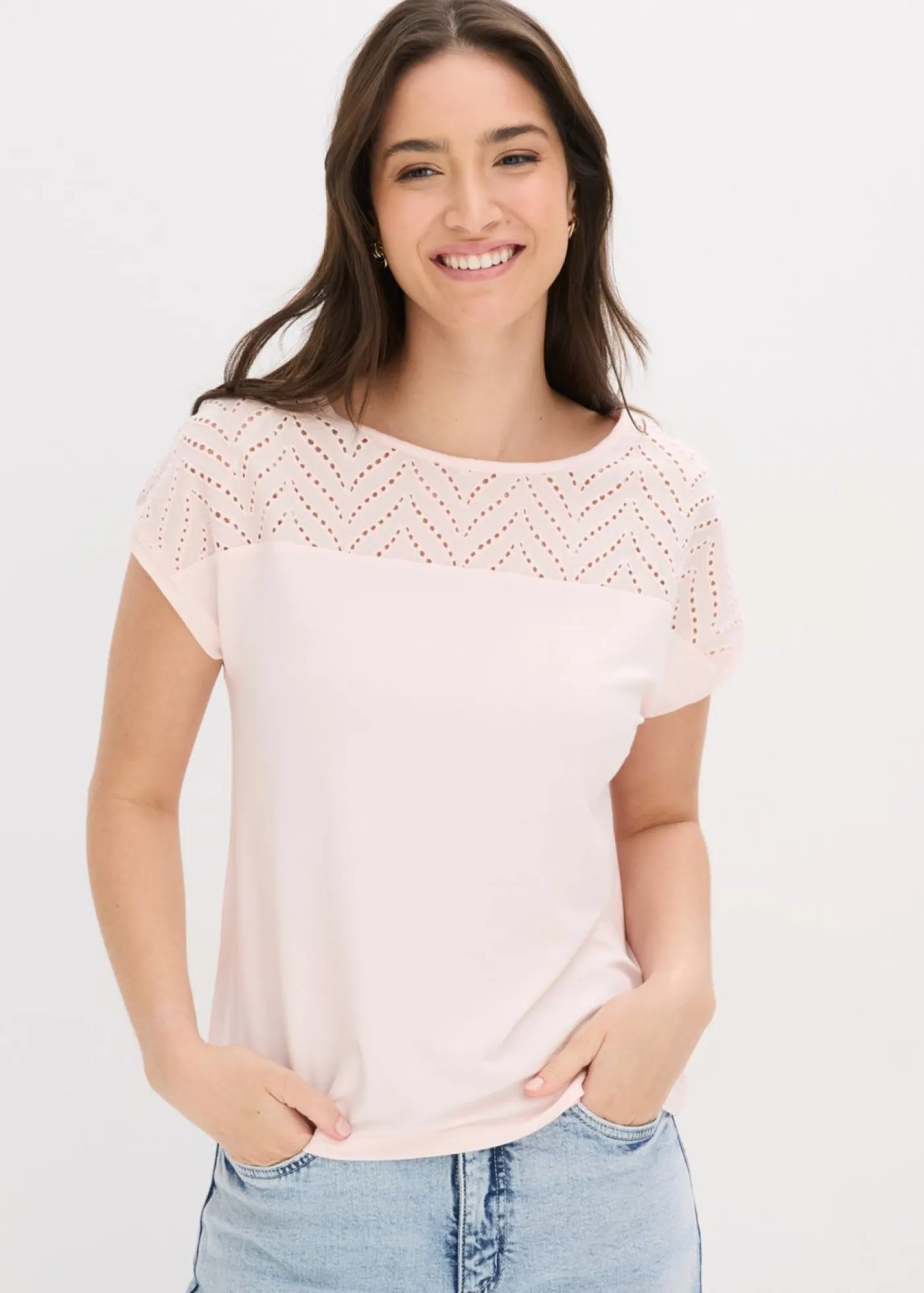 Moderna camiseta con un bordado calado muy femenino en el pecho.