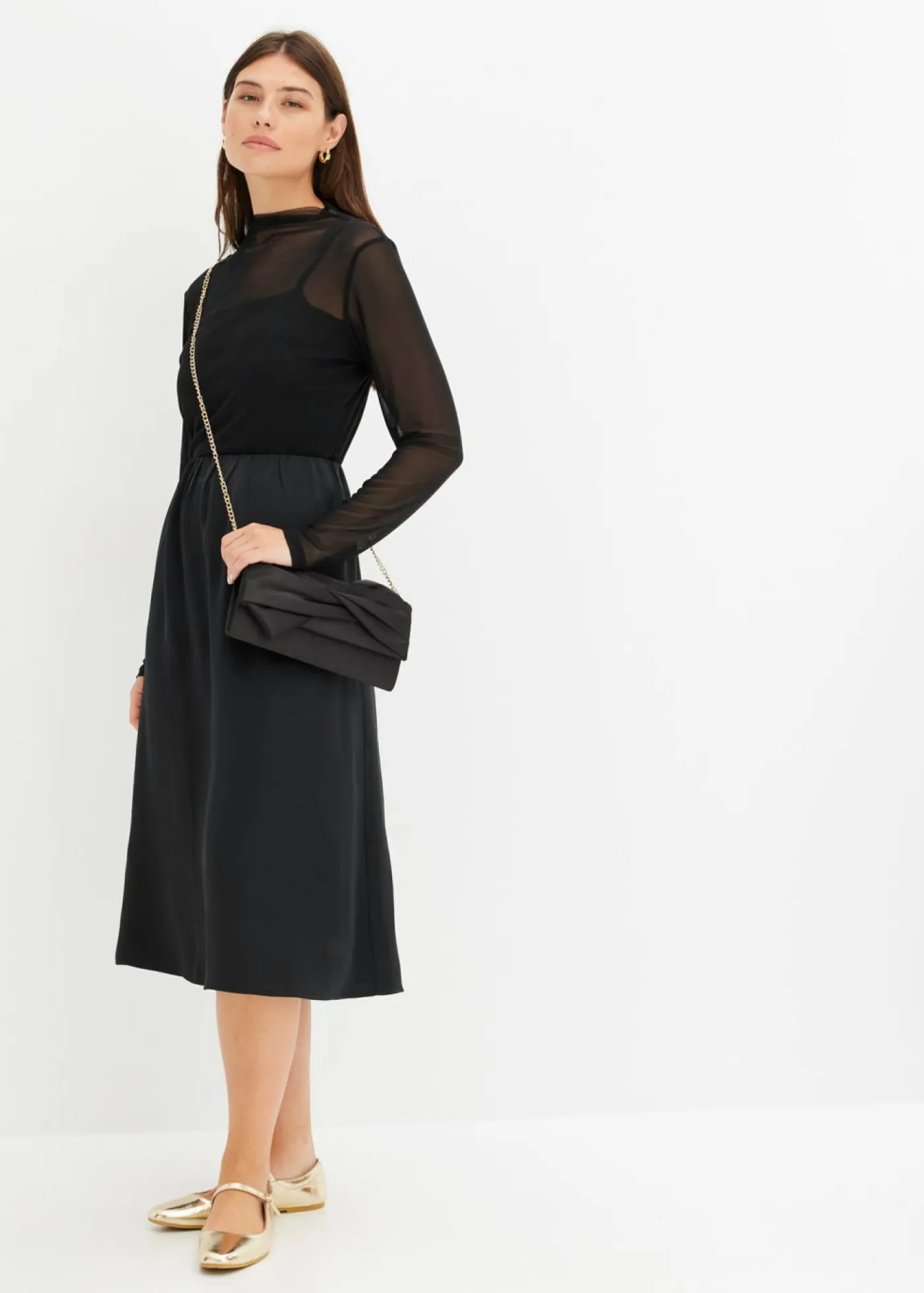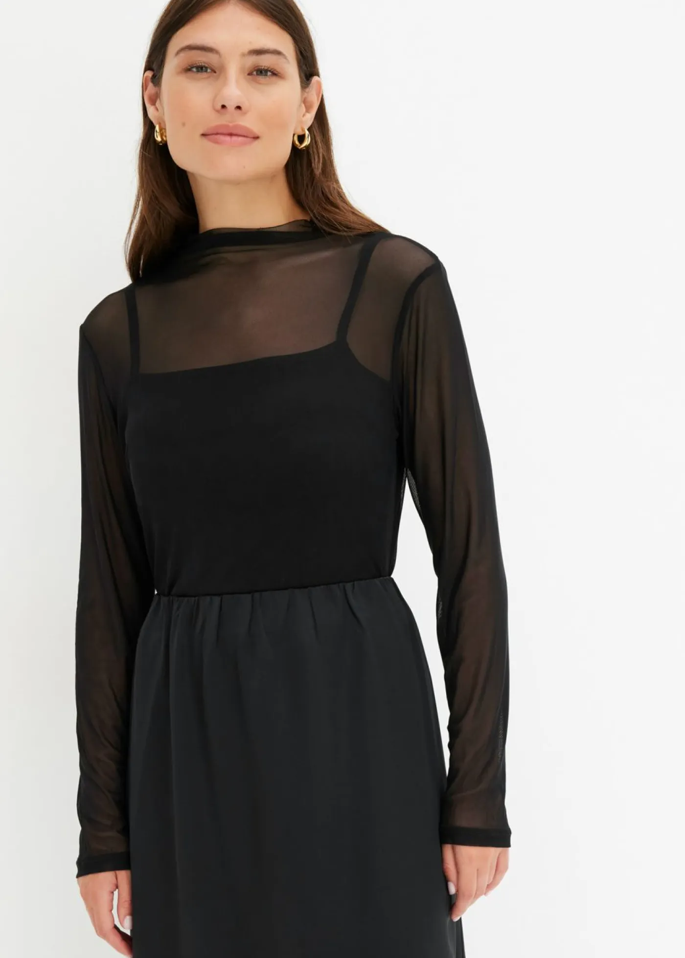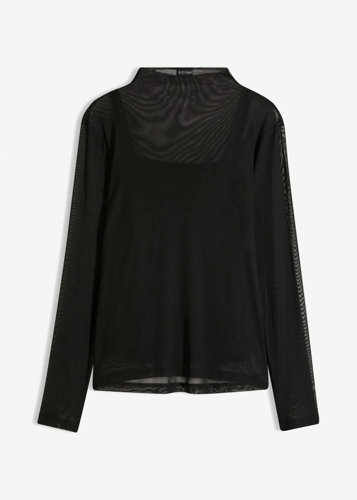 Camiseta ajustada de malla con manga larga y cuello alto.