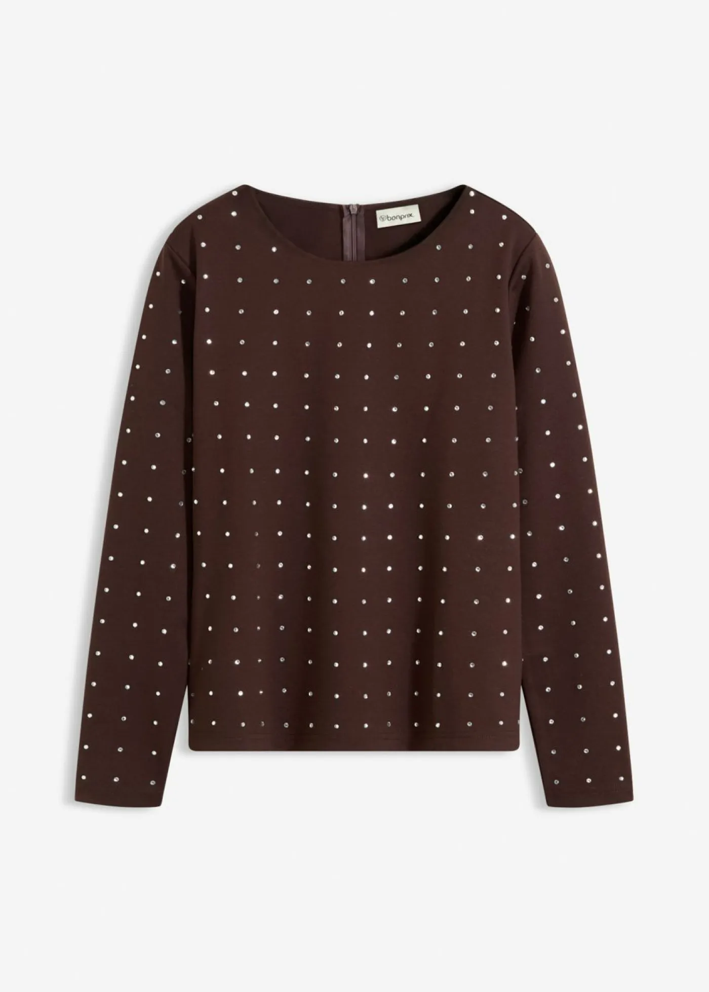 Moderna camiseta de manga larga confeccionada en punto de Roma con aplicaciones de pedrería y cremallera en la espalda.
