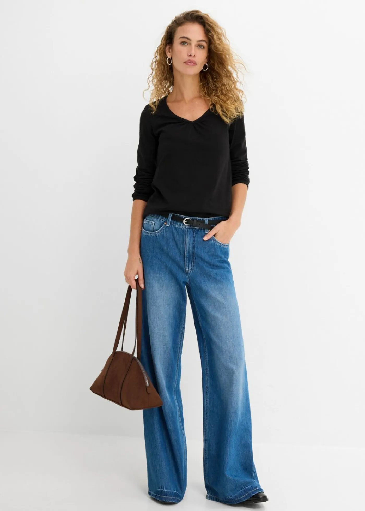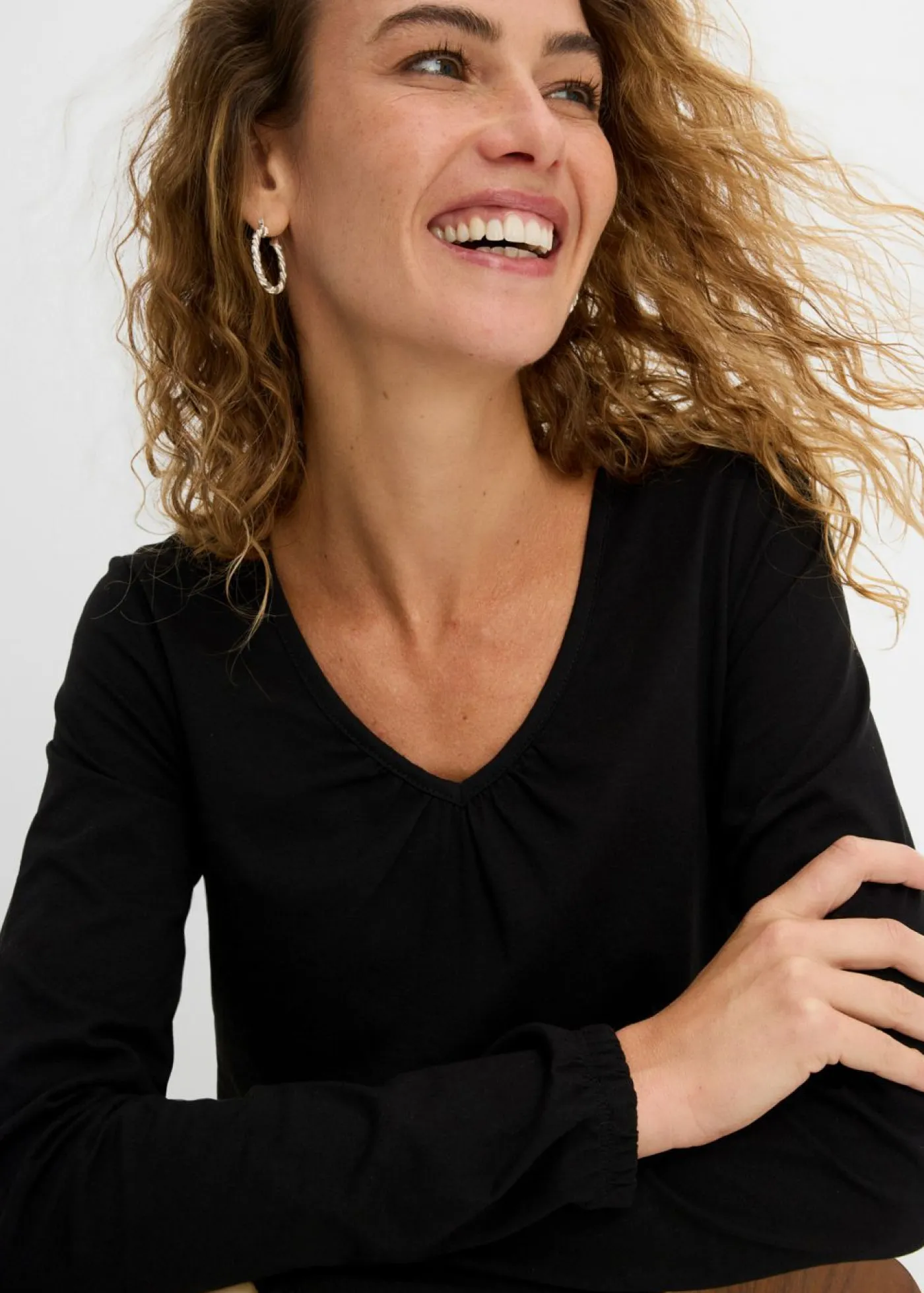 Cómoda camiseta con mangas largas y escote en V. Largo de aprox. 68 cm (talla 36/38) a 78 cm (talla 56/58). Se puede lavar a máquina.